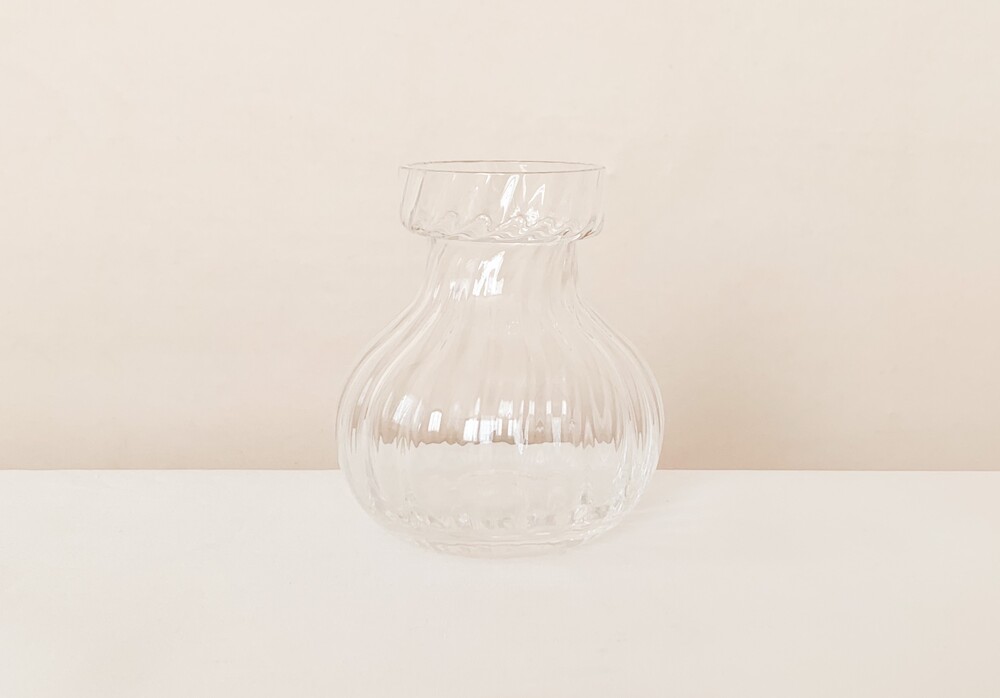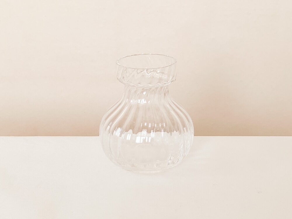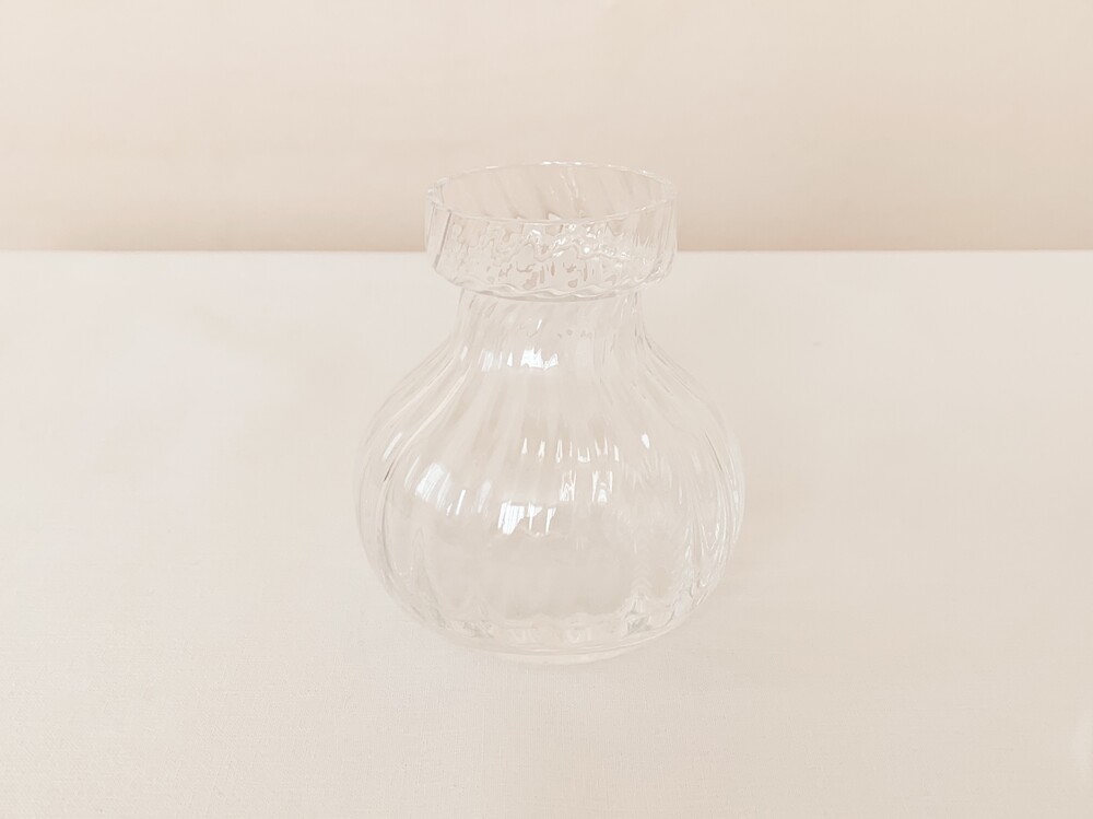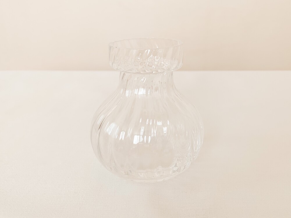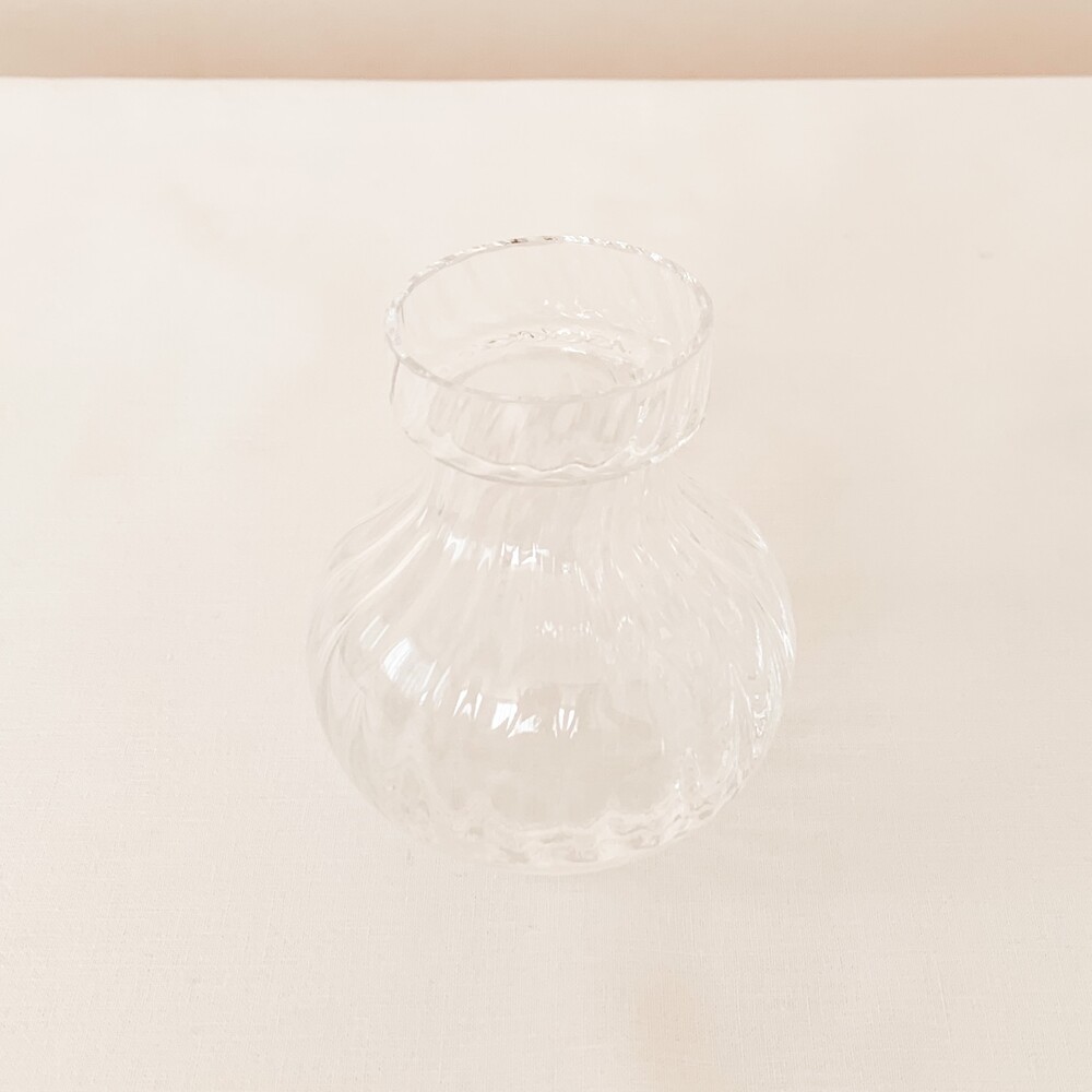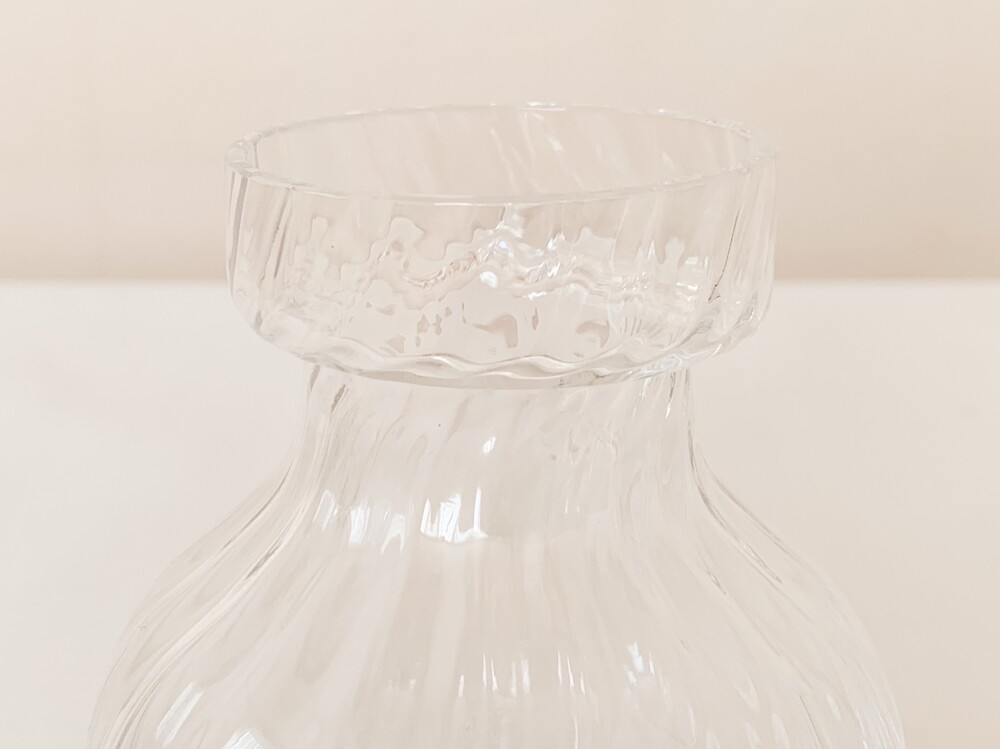 소개해드리는 제품은 1970년대 초반에 제작된 Frank Thrower 것으로, 캔들홀더를 겸하는 작은 화병입니다. 아주 투명하고 맑은 빛을 머금은 크리스탈을 소재로하며- 둥글고 유연한 실루엣, 그 흐름을 돋보이게 하는 일정한 간격의 스윌패턴이 장식되어 있습니다. 병의 입구는 꽃을 꽂거나 초를 올려둘 수 있는, 조심스런 변화로 완성되었고- 아랫쪽의 보울은 자연스럽고 풍성한 곡선으로 만들어져, 단순하지만 지루하지않고 화려하지만 과장됨이 없는 다팅톤 특유의 아름다움이 잘 보여집니다. 만들어질때에 떠올려졌을 장면처럼, 꽃을 몇송이 담아두거나 초를 켜는 용도로 잘 어울리며- 고유의 아름다움을 그대로 전하며 공간에 반짝임을 더해주는 오브제도 놓아두기에도 잘 어울립니다.