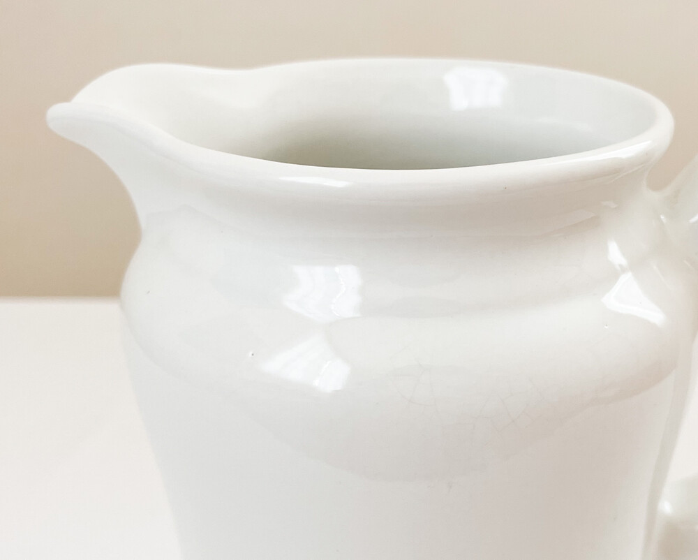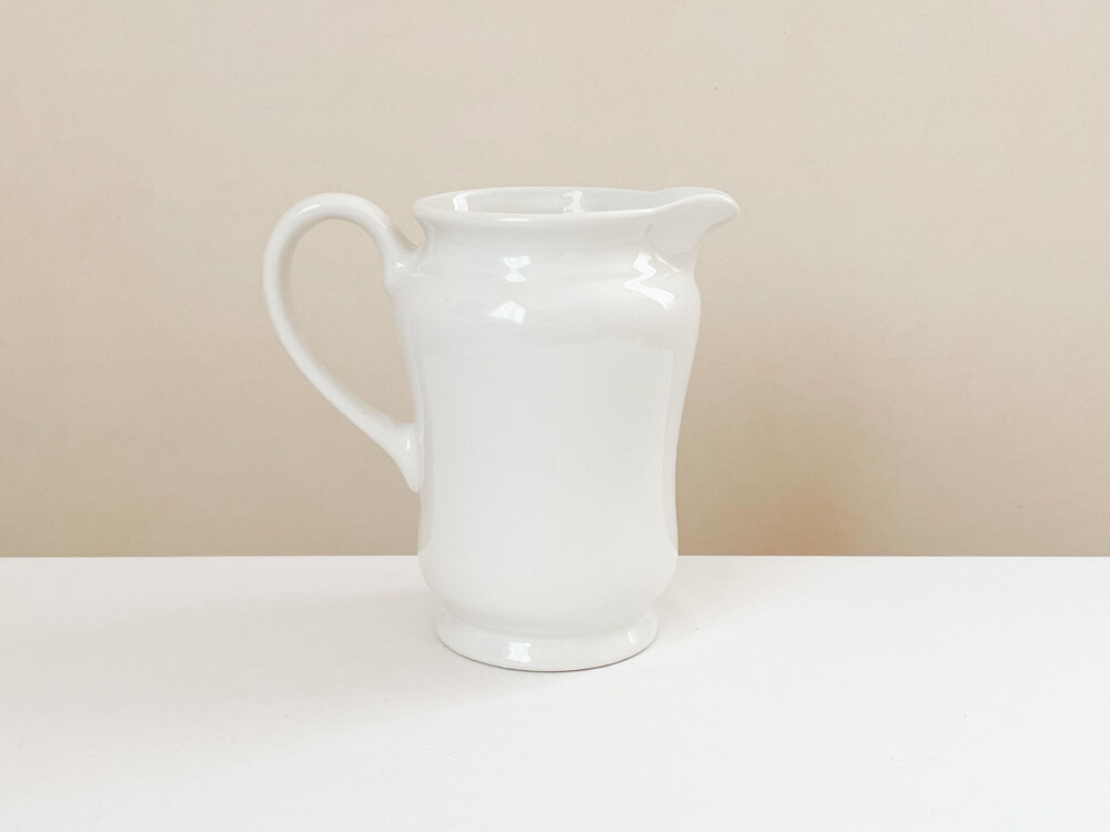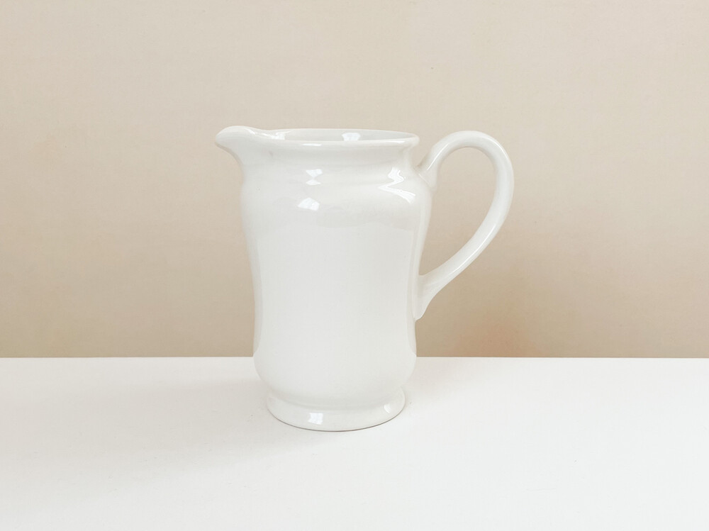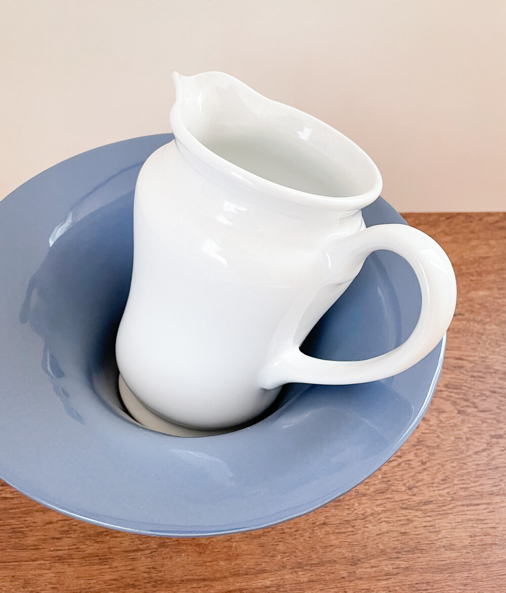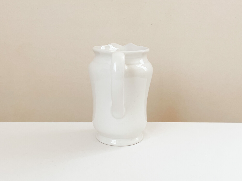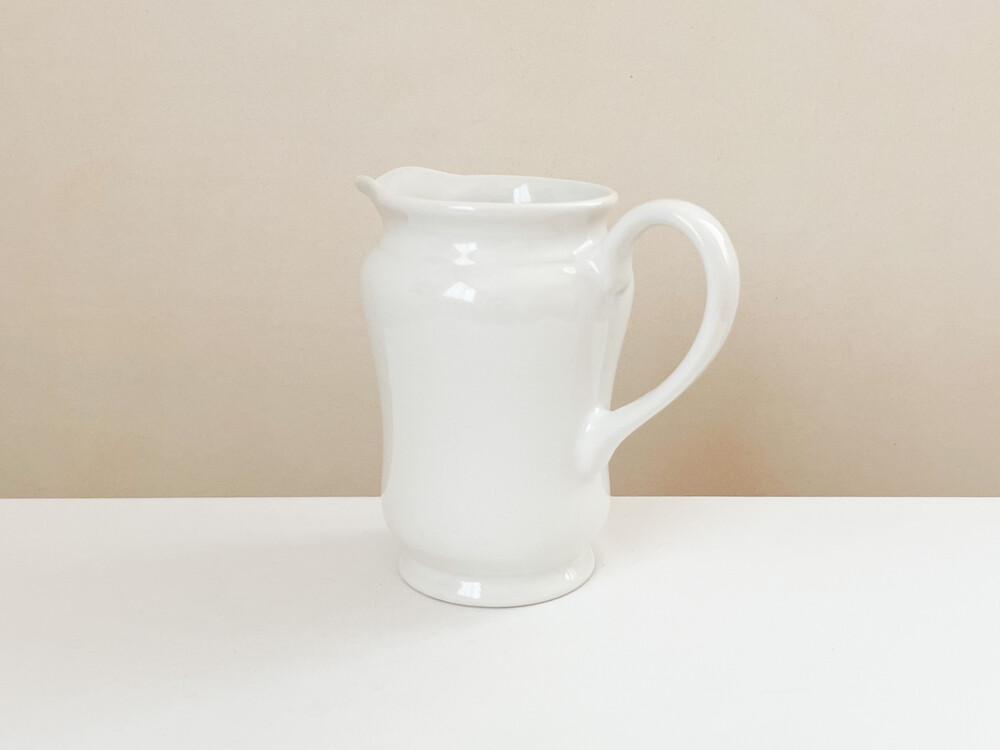 1970년대 영국에서 만들어진 빈티지 저그입니다. 1800년대 부터 영국의 주요 도자기스튜디오들이 모여있던 스토크온트렌트 버슬렘지역에서 일상생활 가까이에서 쓰일 수 있는 도자기들을 만들어오고 있는 브랜드의 제품입니다. 스톤웨어를 소재로, 아침식사를 위한 티보울과 커다란 머그, 식탁위의 물병이나 과일이나 빵을 담아두는 넓은 바스켓을 주로 제작했으며- 식기가 사용되는 구체적인 장소나 시간을 바탕으로 색과 모양을 정리해 그릇들을 만들었던 것으로 전해집니다. 특유의 밝은 분위기와 실용적인 소재, 다정한 손길이 깃든 테이블웨어들은 식탁위의 그릇들로, 수집품으로 귀한자리를 지키고 있습니다. 소개해드리는 제품은 풍성하고 자연스러운, 단정한 곡선들이 전체에 보여집니다. 부드러운 리듬이 보여지는 넓은 가장자리, 살며시 넓어지고 좁아지며 흐르는듯한 선을 그려내는 바디, 유연하고 시원한 실루엣으로 완성된 손잡이로 모양을 이루는 저그는, 당대의 모던과 고전의 우아함을 함께 가지고 있습니다. 정돈된 선과 깨끗한 색과 소재, 그 사이로 보여지는 여유로움으로 부터 완성된 적절한 조화와 균형이 아름답습니다. 매일 사용하는 물병으로, 부엌의 샐러드 채소들을 신선하게 보관하는 팟으로 사용하기에 알맞으며, 선명하고 단정한 모습의 색의 꽃을 담아두는 화병으로도 잘 어울립니다.