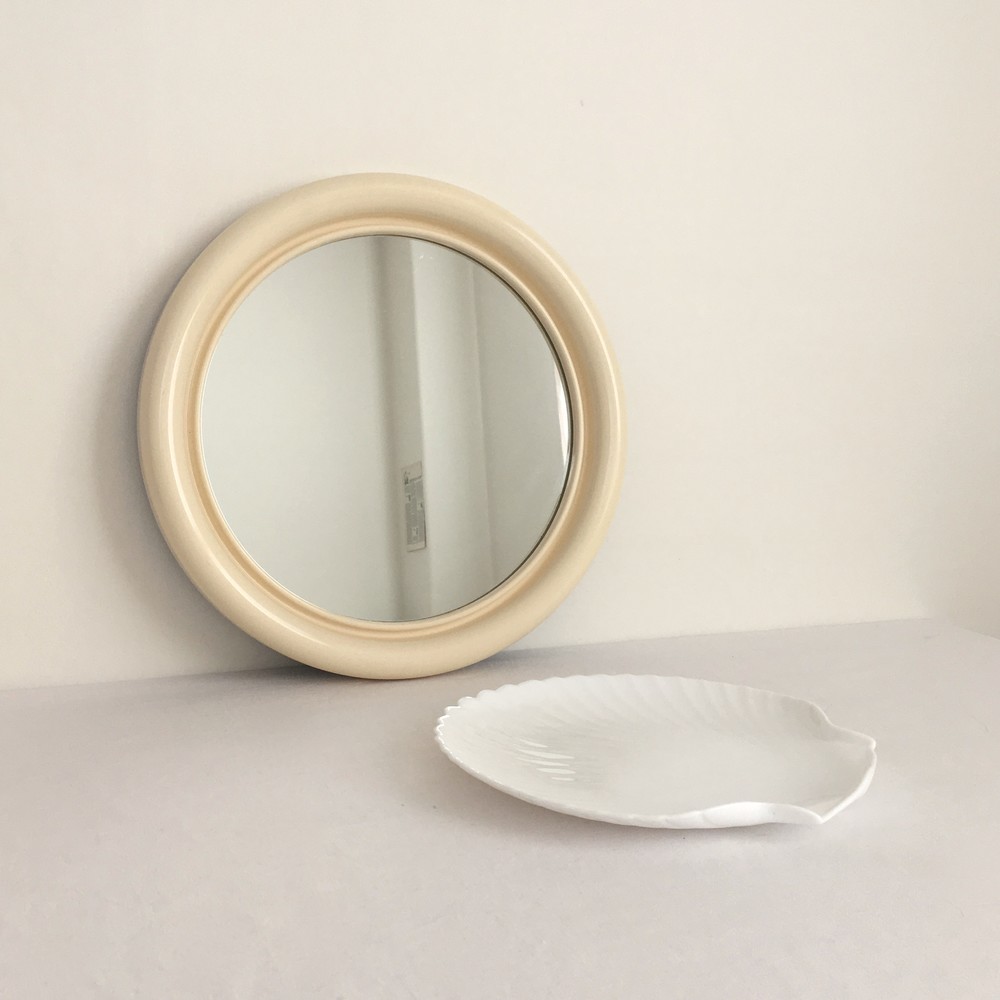 하비타트는 1964년에 설립된 영국의 하우스홀드 브랜드로, 산업디자이너로서 중요한 위치를 가지고있는 콘란에의해 시작 되었습니다. 하비타트라는 이름이 의미하는 것처럼 살아가는데 필요한 여러가지 물건들을 만들어내고있습니다. 미드센츄리디자인과 바우하우스를 기반으로, 보기좋은 디자인과 실용성- 좋은품질과 맥락을 잘 갖춘 적당한 제품들을 제작하며 영국 및 유럽내에서 현재까지도 보편적인 인기를 유지하고 있습니다. 소개해드리는 제품은 1970년 대 초중반 콘란이 직접적으로 하비타트에 관여했을 당시에 제작된 거울로, 높은 소장가치를 가지고 있기도 합니다.(이 시기의 제품들은 habitat 1964라는 하비타트의 박물관격이었던 공간에서 아카이빙 되어지기도 했습니다). 매끄러운 질감을 가진 밝은 크림색의 프레임으로 만들어진 거울의 프레임은, 정성스런 손길이 곳곳에 닿아있는 아늑한 빛으로 채워진 어떤 공간을 떠올리게 합니다. 거울에 사용된 유리는 거울이 놓여지는 장소의 분위기를 그대로 담아낼 수 있는- 다른색이 섞여있지 않은 깨끗한 모습을 가지고 있으며, 보존상태 또한 아주 훌륭합니다. 적당한 두께감을 가지고있어 벽에 기대어 새워두고 사용하기에도 알맞으며, 거울의 뒷면에는 벽에 걸 수 있는 물방울모양의 홀이 만들어져있습니다. 욕실이나 서랍장 위 또는 적당한 높이로 벽에걸어 단장을 위한 거울로, 조명이나 화병이 놓인 공간에 두어 아름다운 공간의 겹을 만들어내는 오브제로 사용하기에 잘 어울립니다.