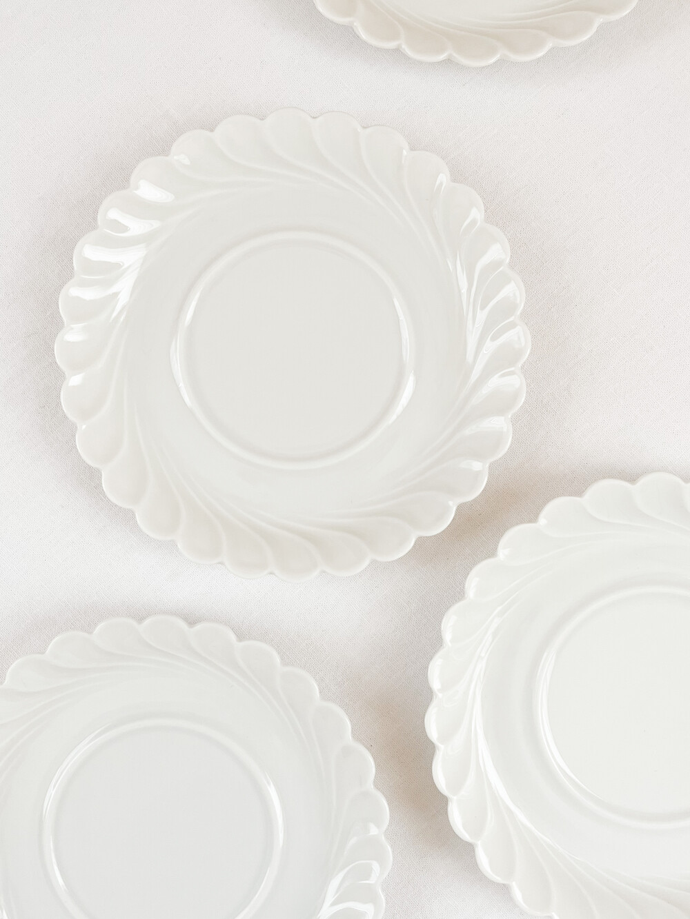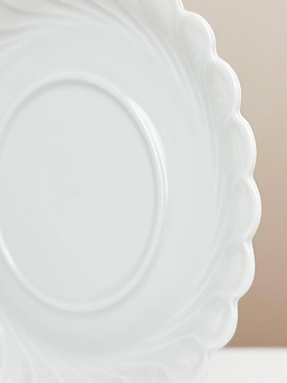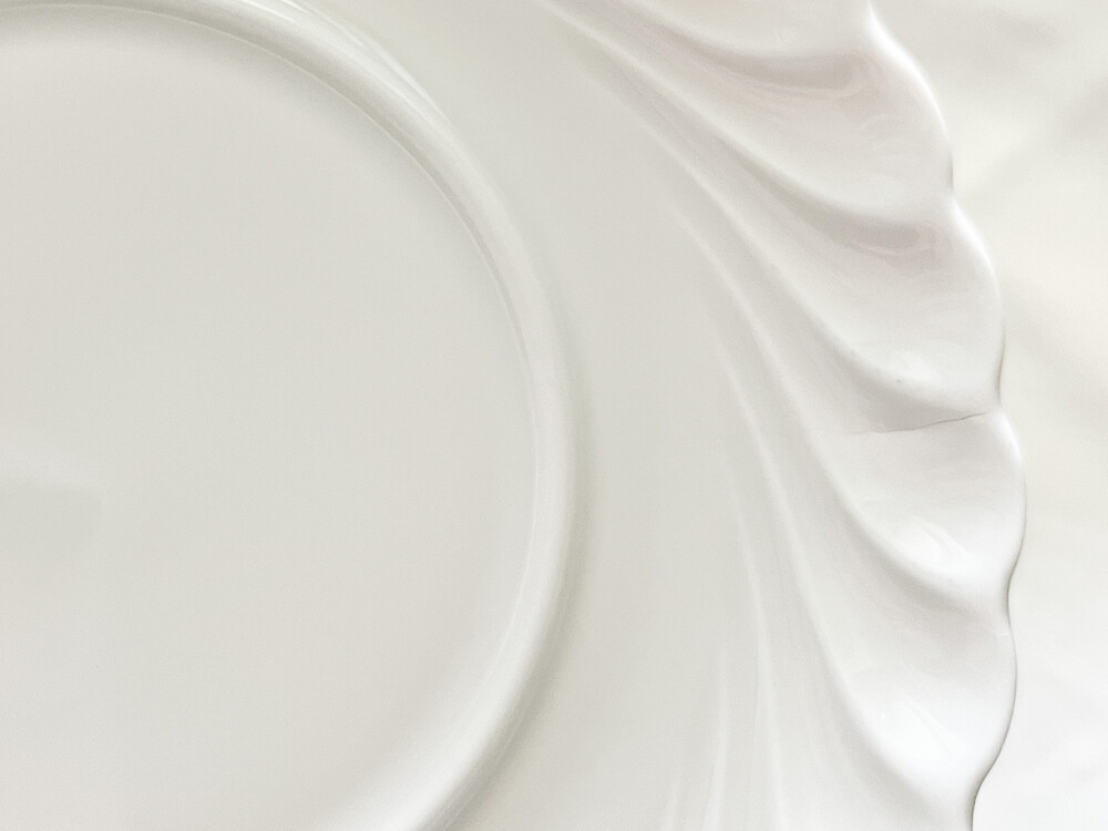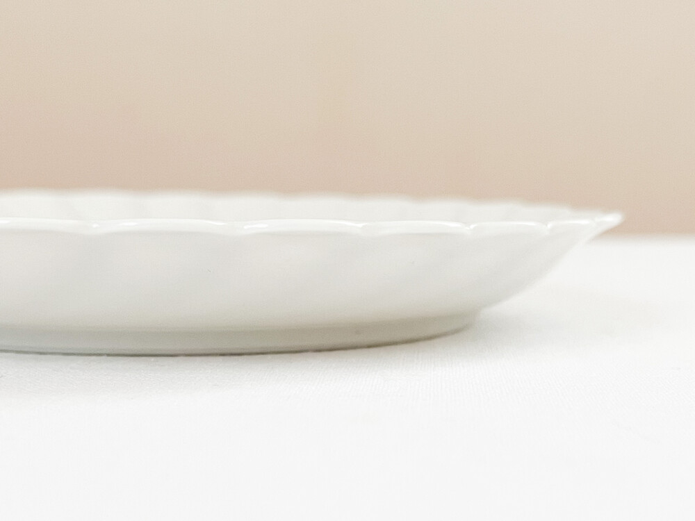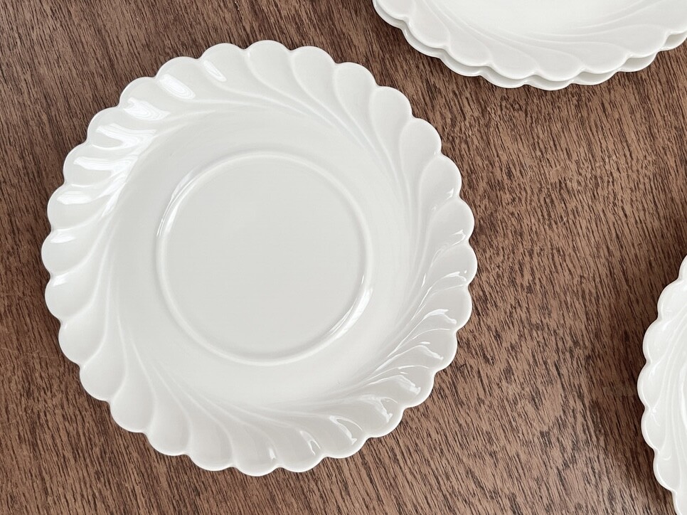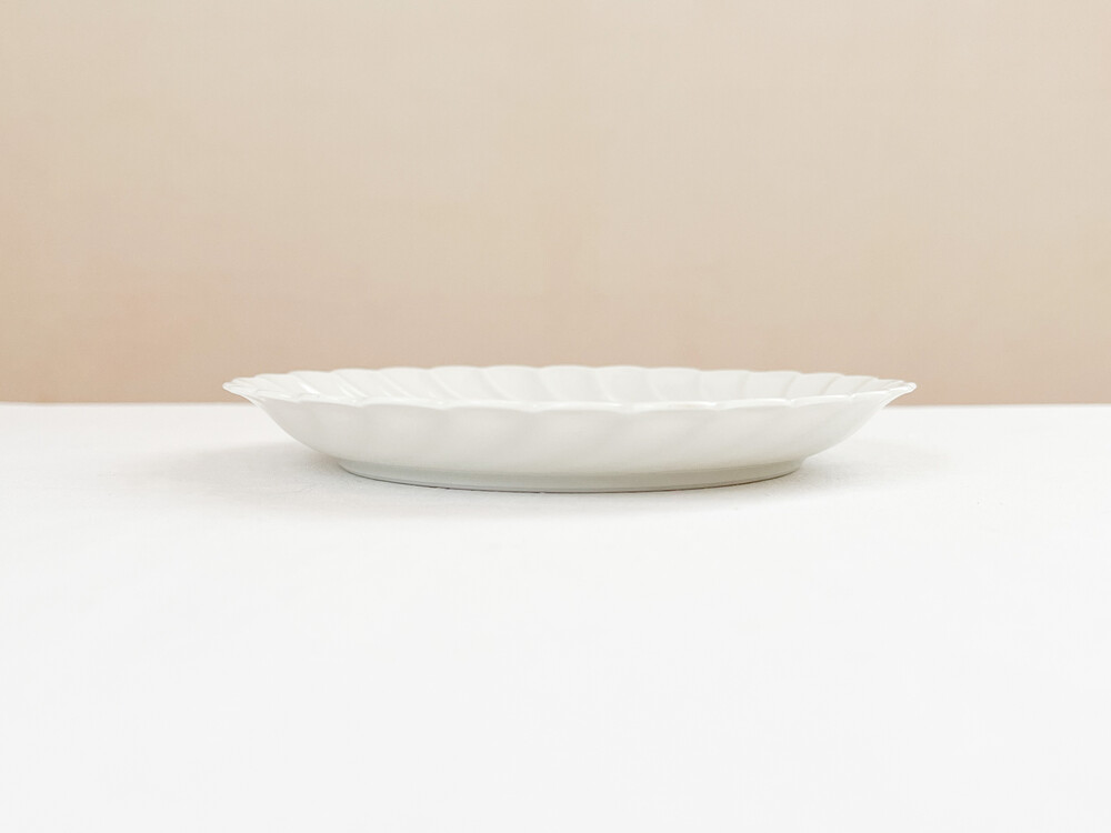 하빌랜드는 포셀린의 주 생산지인 프랑스 리모쥬 지역에서 1840년대에 시작 된 브랜드 입니다. 당시의 무역상이었던 하빌랜드가는 뉴욕의 중산층을 타깃으로, 리모주 포셀린을 수출하였고 안정적인 수요가 있는 바탕을 완성한 후 자신들의 이름을 건 하빌랜드를 만들게 됩니다. 이러한 배경 덕분에 가장 좋은 재료와 리모쥬 최고의 마스터들로 부터 부족한 구석이 없는 고유의 제품들이 만들어지며, 북미지역은 물론 유럽의 왕실과 귀족들의 수집품으로 큰 명성을 가지게 됩니다. 소개해드리는 제품은 1800년대에 후반부터 만들어진 접시가 1970년대에 복각된 제품입니다. 오랜시간 동안 변함없이 사용되는 하빌랜드만의 투명하고 고운결의 포셀린을 소재로합니다. 둥글고 평평한 바닥면에서 시작 된 물결 무늬는, 부드러운 물결이 흐르는 장면을 살며시 멈춰둔 듯 마법같은 순간이 느껴지는 모습으로 표현되어있습니다. 평평하지 않고 살짝 높은듯한 모습의 가장자리 장식은 실크로 만든 레이스 옷깃이 살짝 흔들리는 듯한 모습을 떠올리게 하기도 합니다. 그릇이 놓인 장소의 빛이 고스란히 담기는 섬세한 소재, 우아한 무게의 장식들이 무척 아름답습니다. 차마시는 시간을 위한 달콤한 디저트 한 조각이나 버터를 곁들인 바삭한 토스트를 위한 그릇으로, 공간을 장식하는 귀한 오브제로 놓아두기에도 알맞습니다.