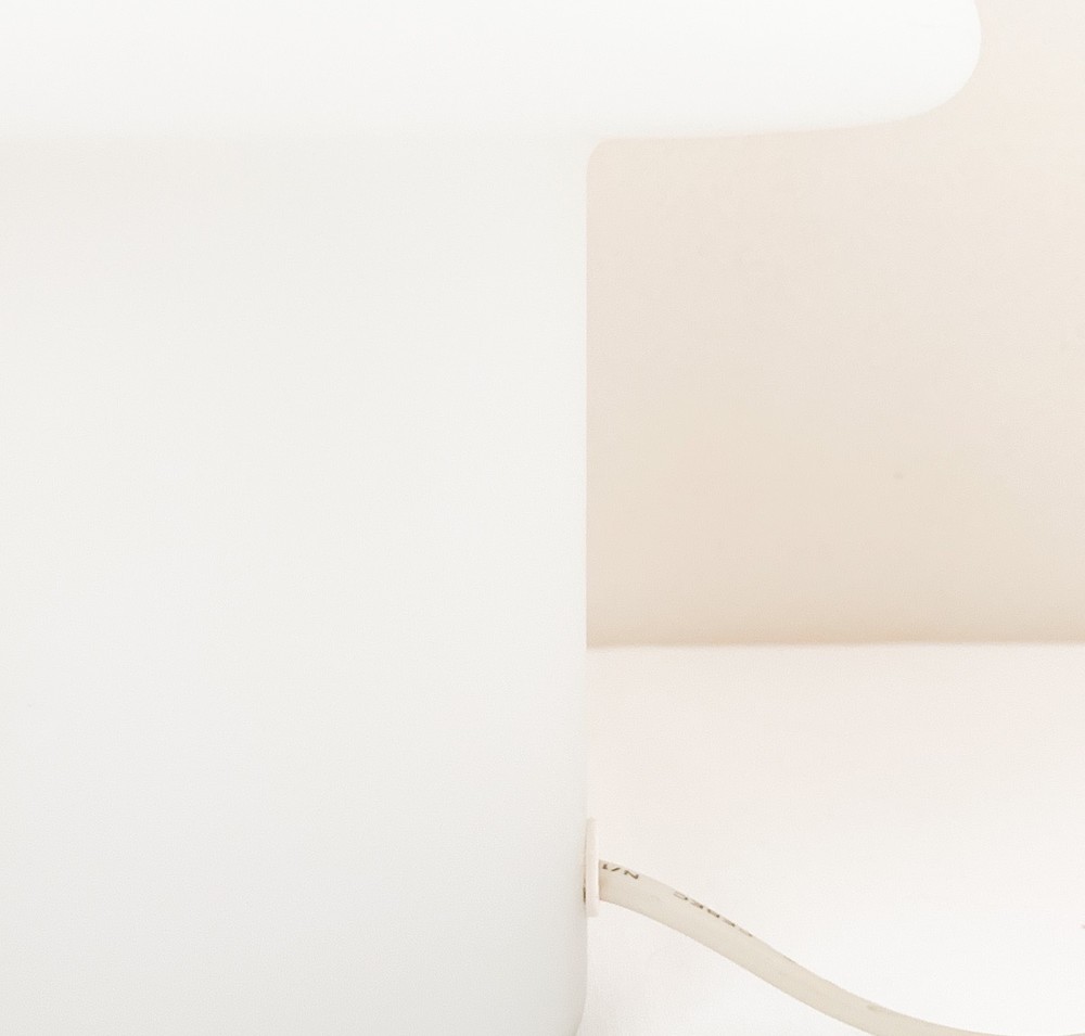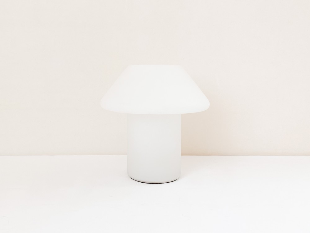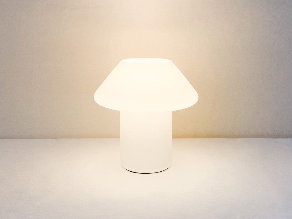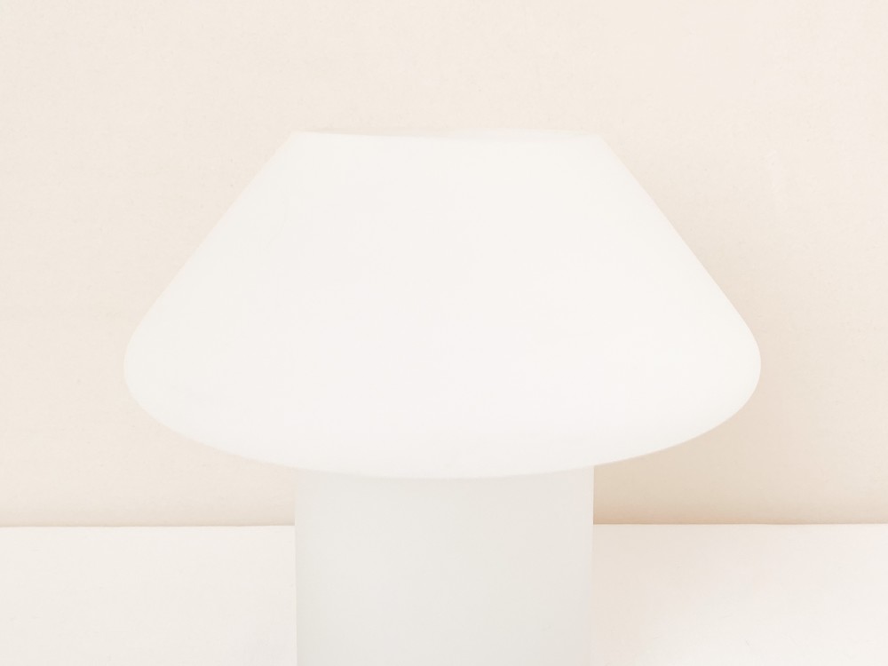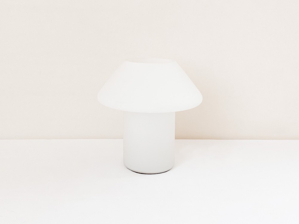 1970년대 후반에서 1980년대 초반 사이에 제작된것으로 전해지는 혼셀의 빈티지 테이블램프입니다. 혼셀은 1840년대부터 실내장식을 위한 유리제품과 조명을 만들었던 독일 네하임지역의 브랜드로, 누구나 편리한 사용이 가능하고 내구성이 좋은 실용적인 기능과 자연(특히 햇빛)이 그러하듯 어느곳에 놓여도 어울림에 무리가 없는 제품을 만드는것을 지향하며- 귀한 수집품으로, 생활에 꼭 필요한 물건으로서의 명성을 유지하고 있습니다. 소개해드리는 제품은, 단단하고 묵직한- 벨벳같은 질감을 가진 유리를 소재로 하는 테이블램프입니다. 낮고 완만하게 펼쳐진 둥근 세이드와 반듯한 원기둥 모양의 베이스로 구성되어있으며, 셰이드와 베이스는 이음새가 없이 단정한 하나의 선으로 완성되었습니다. 램프 베이스 뒷면의 작은 홀을 통해 전선-스위치-플러그가 이어져있습니다. 램프에 불을 켰을때에는 램프 전체에 고르고 밝은 빛이 가득채워지는 모습입니다. 편안한 집중을 위한 책상위의 램프로, 티테이블이나 침실에 두는 휴식을 위한 따스한 조명으로 사용하기에 잘 어울립니다.