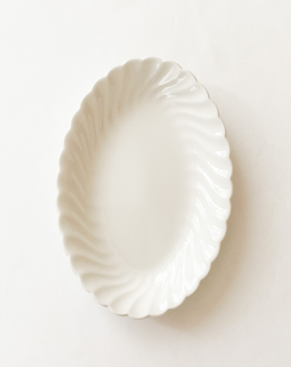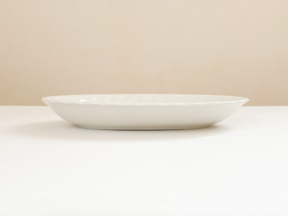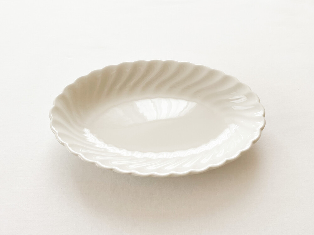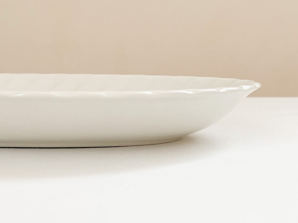 존슨브라더스는 1883년 영국 도자기의 중심지 스토크온트렌트에서 시작된 브랜드입니다. 화이트웨어라는 식탁의 기본이 될 수 있는 모티브를 가지고, 사용과 관리가 편리한 도기와 좋은 내구성이 좋은 자기의 특징을 두루 갖춘 테이블웨어를 만들었습니다. 1900년대에는 영국 왕실이 주최가되는 어워드에서 좋은성과를 거두며 가치를 증명하였고, 쓰임새좋은 생활용품과 훌륭한 수집품으로서의 위치를 유지하고 있습니다. 소개해드리는 제품은 1970년대에 제작 된 타원 접시입니다. 존슨브라더스 고유의 차분한 하얀색의 아이언웨어를 소재로하며, 완만하고 깊은 안정감 있는 실루엣으로 빚어졌습니다. 가장자리에는 가지런한 레이스 장식을 놓아 소재의 아름다움과 빛의 일렁임을 가득히 담아냅니다. 희소성이 무척 높은 시리즈로 귀한 수집품으로서의 의미가 충분하며, 적당한 크기와 비교적 넉넉한 깊이를 가지고 있어 일상에서 여러 용도로 사용하기에 알맞습니다. 샌드위치를 나란히 담아내는 그릇이나 수프 그릇으로, 따뜻한 커피가 담긴 컵과 비스킷 한조각을 함께 내는 트레이로 사용하기에 잘 어울립니다.