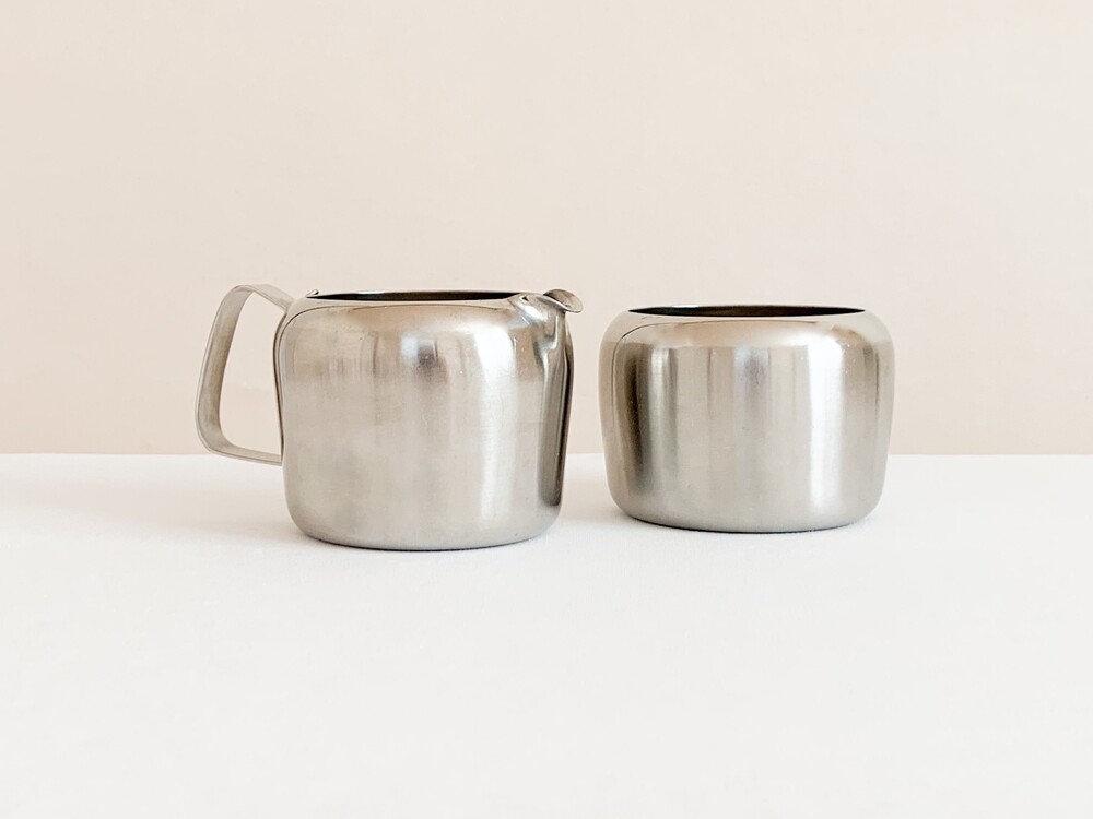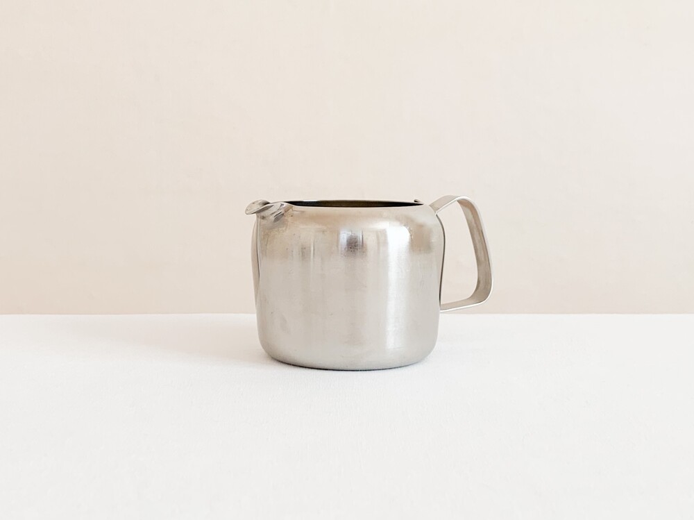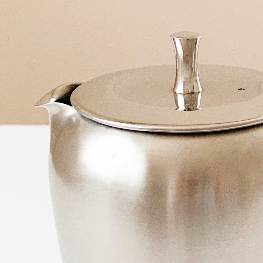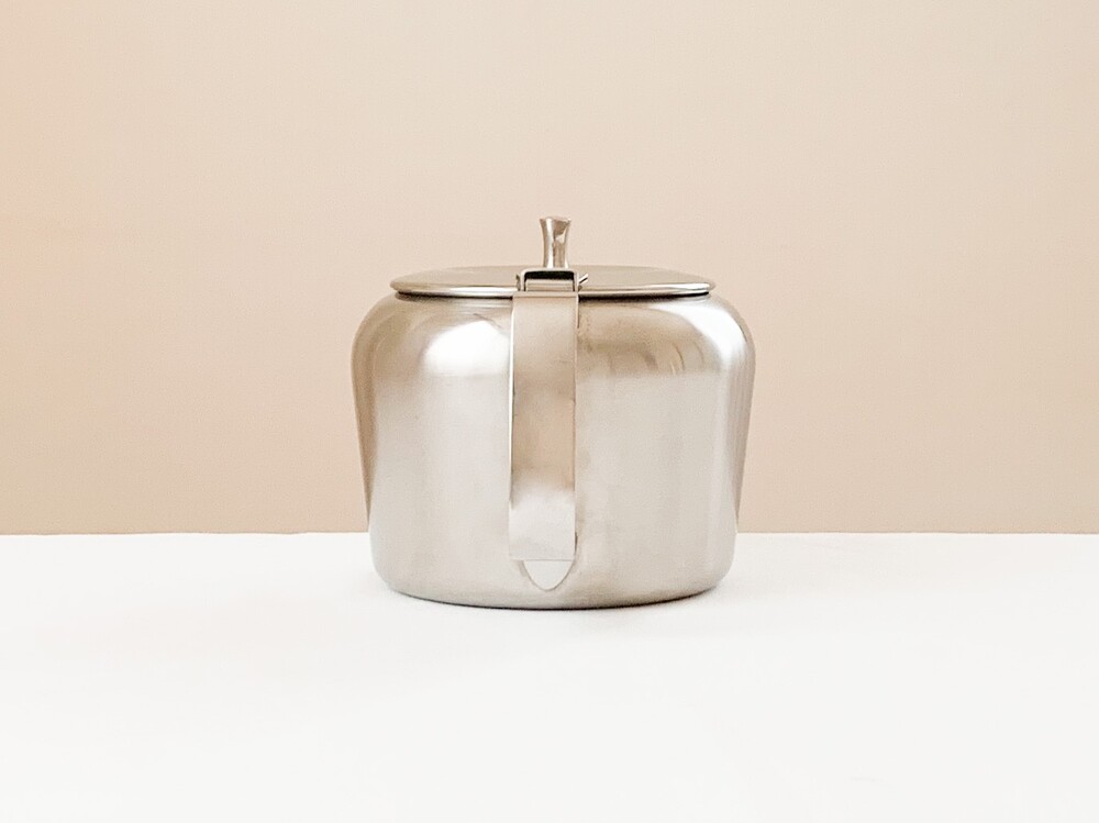 소개해드리는 제품은 디자인어워드에서의 좋은 성과와 로열개런티 가지게 된 이후, 보다 안정적이고 다양한 모습의 제품을 생산했던 시기인 1970년대 초중반 즈음 만들어진 티세트입니다. 티팟과 워터팟 그리고 크리머&슈가보울이 준비되어 있으며, 밀도가 높고 매끄러운 스테인리스 스틸을 소재로 만들어졌습니다. 아래를 향해 살짝 잘록해지는 부드러운 실루엣을 바탕으로 단정하고 세심하게 다듬어진 디테일들을 살펴볼 수 있습니다. 견고하고 변함없는 소재의 무게감과, 유연하고 섬세한 표현들이 만들어내는 균형이 아름답습니다. 넉넉한 용량과 직화사용이 가능해 여러 용도로 편하게 사용할 수 있으며- 매일 사용하는 식탁위의 물주전자로, 여유롭고 아름다운 오후의 티테이블을위한 티웨어나 공간에 은은한 빛을 실어주는 오브제로 사용하기에 잘 어울립니다.