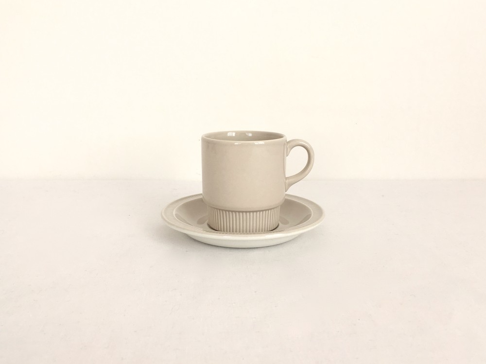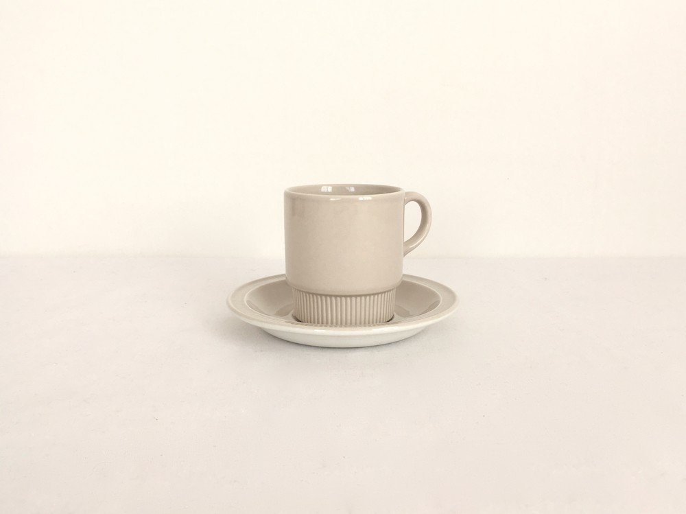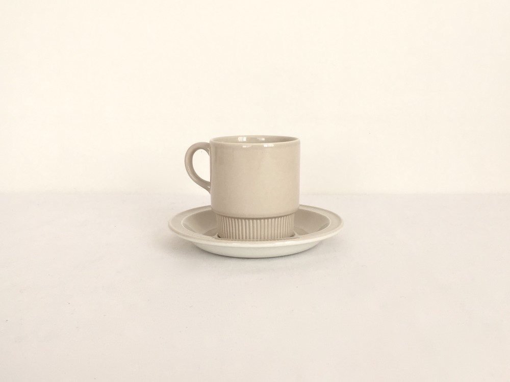 풀은 1873년 건축용 도자기장식이나 타일을 만드는 회사로 시작되었고, 1900년대 초반부터 도자기 테이블웨어를 만들었던 영국의 브랜드입니다. 소개해드리는 제품은 색감의 표현이 주가 되었던 50년대와 60년대의 제품들을 지나 실용성이 더해진 70년대에 생산된 찻잔세트입니다. 유앤웬즈데이에서 종종 소개 해드렸었던 스톤웨어시리즈 중 한 가지로, 풀의 전성기인 1900년대 초반부터 깊은색감이나 명료하고 섬세한 선의 사용 등- 풀의 정체성을 갖추는데 중요한 역할을한 디자이너 로버트 제퍼슨의 1960년대 디자인을 기반으로 만들어졌습니다. 소개해 드리는 찻잔세트는 1970년대 초반에 제작 된 것으로, 단단하고 무겁지않은 스톤웨어를 소재로합니다. 밝은 크림색의 도자기를 바탕으로 부드러운 색감의 모래색 유약이 엷게 입혀져 있으며, 담담한 전체의 모습에 거슬리지 않는 가지런한 빗살무늬가 잔의 굽부분과 잔받침의 가장자리에 장식되어있습니다. 소재와 색감, 전체의 모습을 이루는 단정한 선들이 편안하고 따스한 리듬을 전해줍니다. 촘촘한 거품을 얹은 라테나 밀크티를 마시는 잔으로 잘어울리며, 매일 사용하는 식탁위의 물잔으로 사용하기에도 알맞습니다.