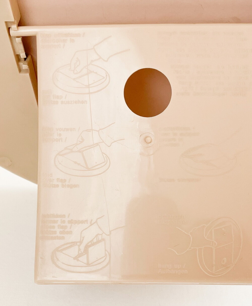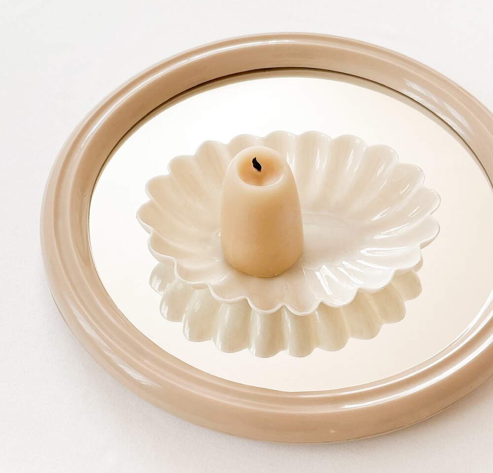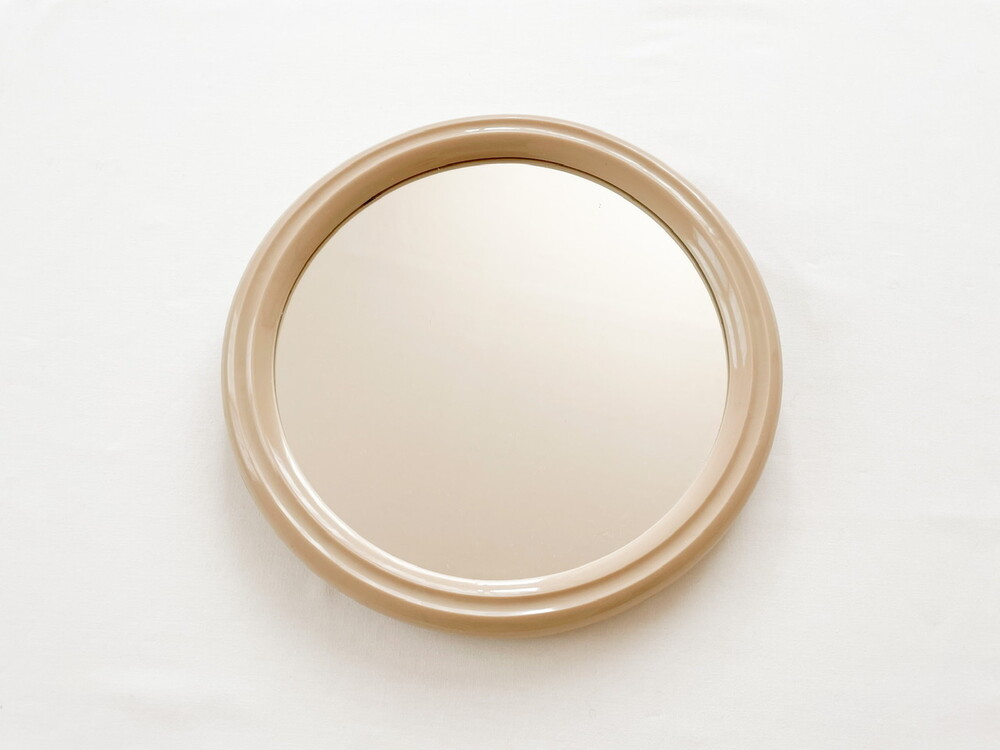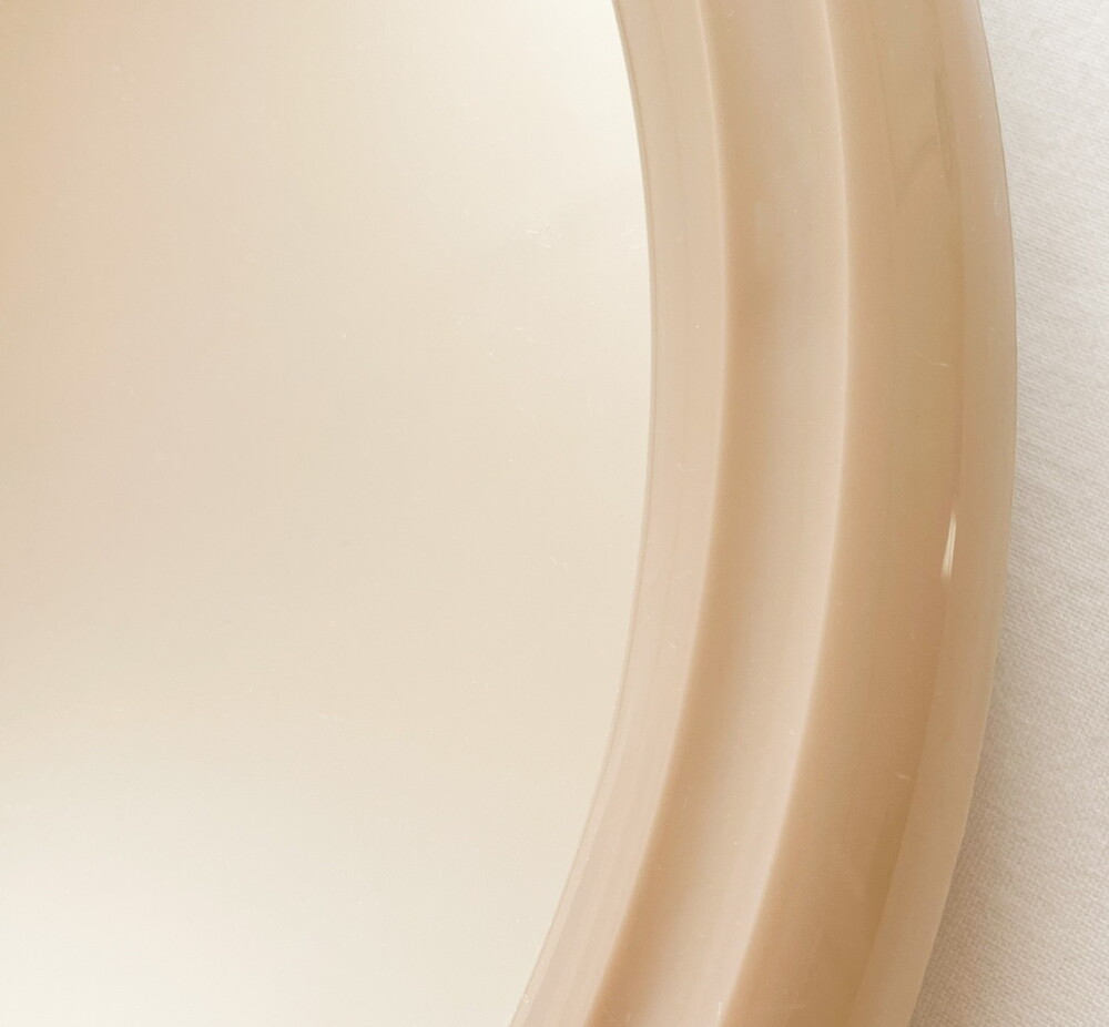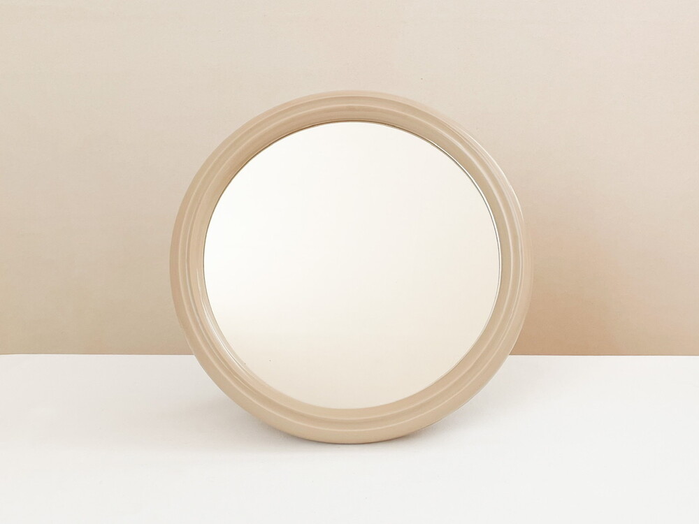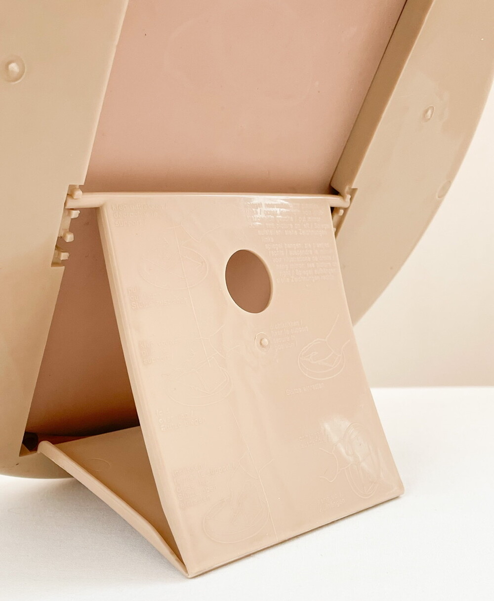 1970년대 네덜란드에서 만들어진 거울입니다. 깨끗한 색의 유리와 밀도 높은 아크릴을 소재로 제작 되었습니다. 밝은 크림베이지의 둥근 프레임은, 안정감을 전해주는 깊이와 매끄러운 질감이 돋보이는 단정한 장식을 가지고 있습니다. 유리의 반짝이는 맑음, 프레임의 색과 감촉에서 차분하고 따뜻한 분위기가 전해집니다. 거울의 뒷면에는 벽에 걸 수있는 세 개의 홀, 탁상용으로 사용할 수 있도록 만들어진 접이식 스탠드가 있습니다. 욕실이나 현관에 놓아두는 단장을 위한 거울로, 빛이 잘 드는 곳이나 조명이 가까이에 있는 공간에 두어 아름다운 겹들을 만들어내는 오브제로 사용하기에 잘 어울립니다.
