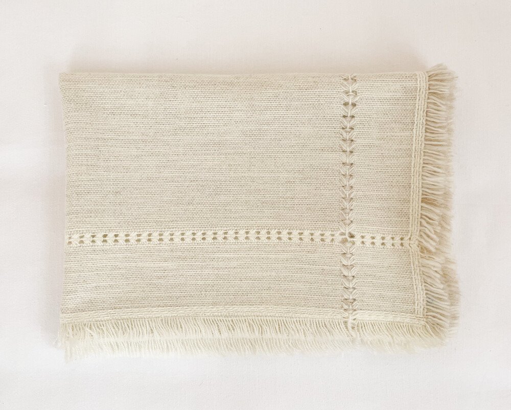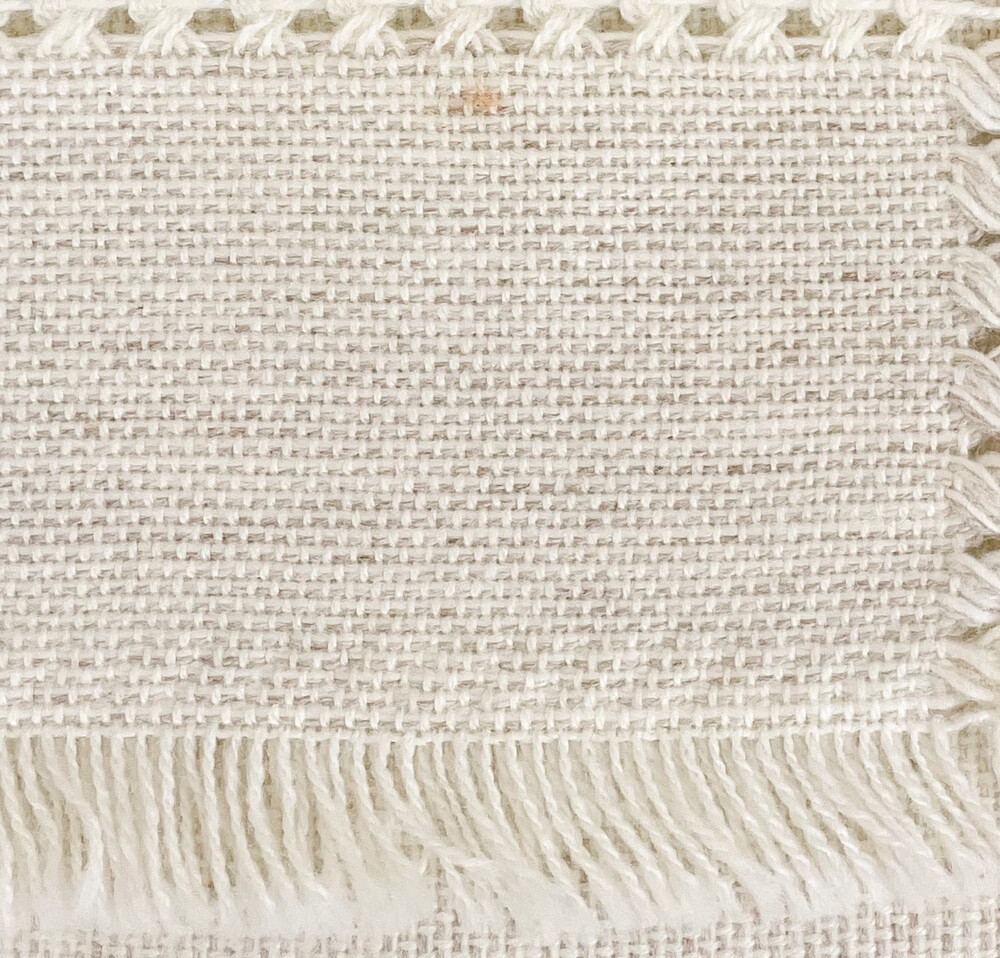 1970년대 영국에서 만들어진 위빙담요입니다. 아주 부드럽진 않지만 튼튼하고 흐트러짐 없는 특징을 가진 실을 소재로 합니다. 추운계절의 따뜻한 물건에 잘 어울리는- 레몬주스의 환한빛이 살짝 스며있는 아이보리를 바탕으로, 우윳빛, 엷은 오트밀색 같은 자연스럽고 밝은 계열의 색들이 아름다운 배열로 모여 화사한 포근함을 전해줍니다. 가로 세로 가장자리 즈음을 따라 꽃봉오리를 닮은 무늬가 나란히 보여지며, 그 바깥쪽으로는 적당한 길이의 수술장식이 만들어졌습니다. 무릎담요나 침실의 스프레드, 가볍게 사용하는 카펫, 선선한 계절의 피크닉 매트로 사용하기에도 알맞습니다.