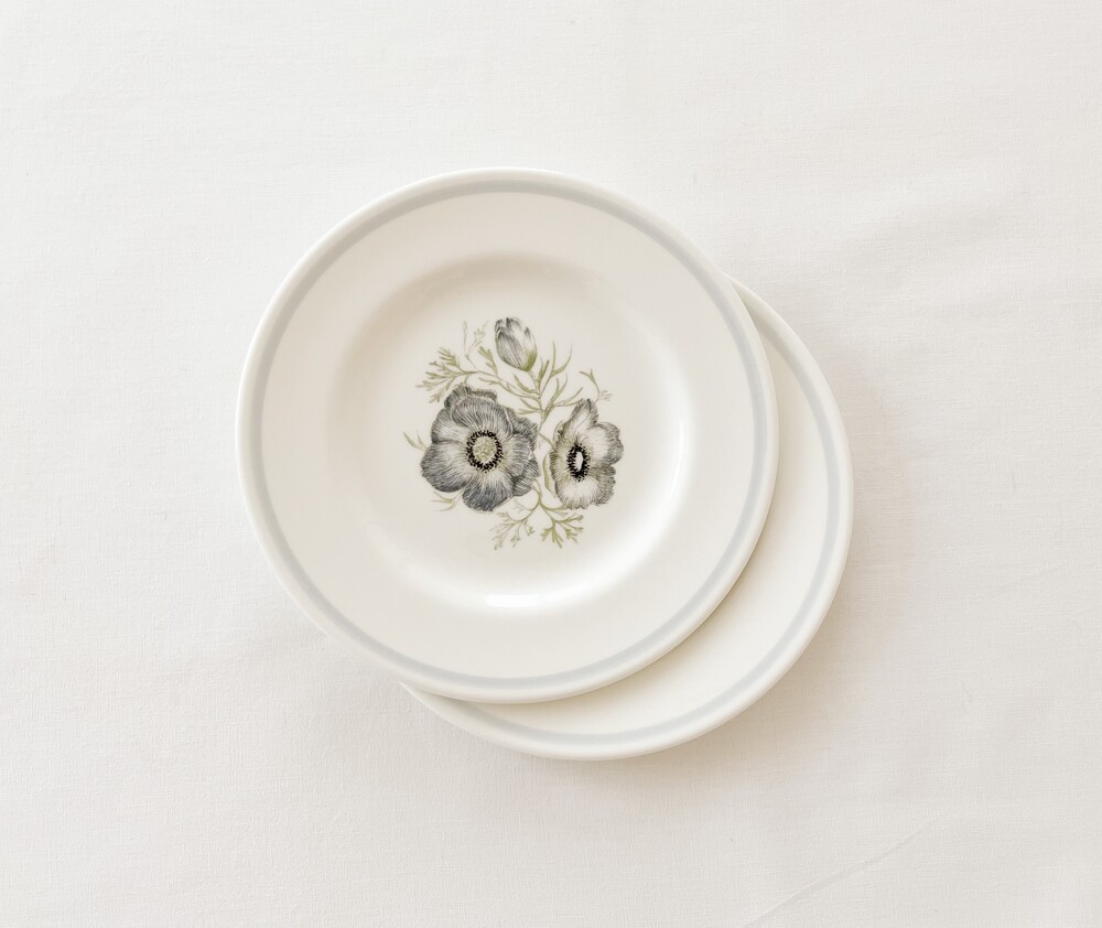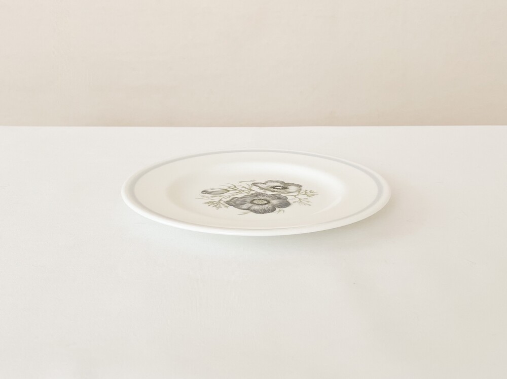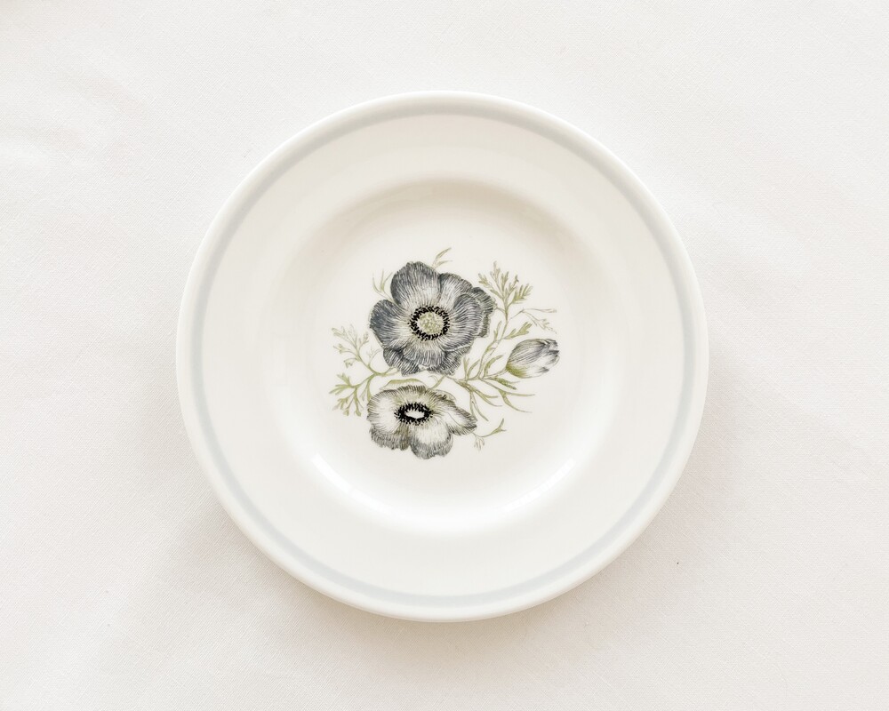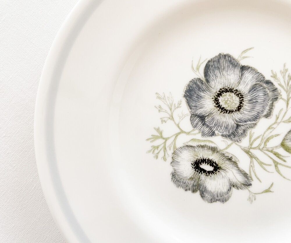 1970년대 후반에 만들어진 웨지우드의 빈티지 접시 입니다. 웨지우드는 1759년 부터 영국의 버슬램지역에서 도자기를 만들어온 브랜드입니다. 고급 티웨어와 식기들, 그리고 도자기 장식품들을 만들며 가치를 쌓아오는 웨지우드는 1760년대 부터 왕실에서 사용하는 도자기를 제작하게 되기도 합니다. 섬세한 디자인과 좋은 품질의 도자기를 꾸준히 만들어내며, 영국을 비롯한 도자기라는 카테고리를 대표하는 브랜드로 자리잡게 됩니다. 소개해드리는 제품은- 투명함이 느껴질만큼 맑고 고운 결의 본차이나를 소재로 하며, 낮고 넓게 둥근- 우아한 실루엣를 가지고 있습니다. 접시의 가운데에는 봉오리 부터 만개한 모습까지의 아네모네가 차분한 초록과 푸른빛의- 섬세한 터치로 표현되어 있습니다. 모티브의 생기있는 우아함과 가느다란 선의 조화가 무척 아름답습니다. 다가오는 봄을 가까이에 들여둘 수 있는 아름다운 오브제로, 차마시는 시간의 디저트를 담아내거나 식사시간에 여유로움을 더해주는 그릇으로 사용하기에 잘어울립니다.
