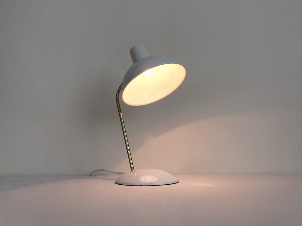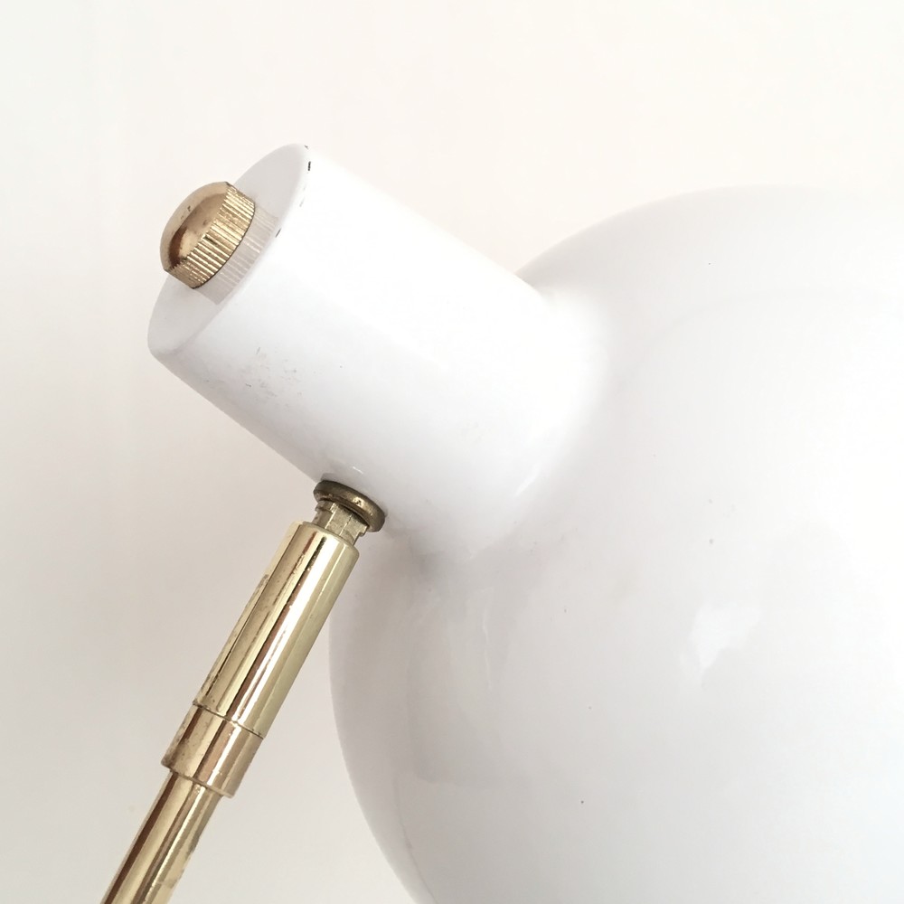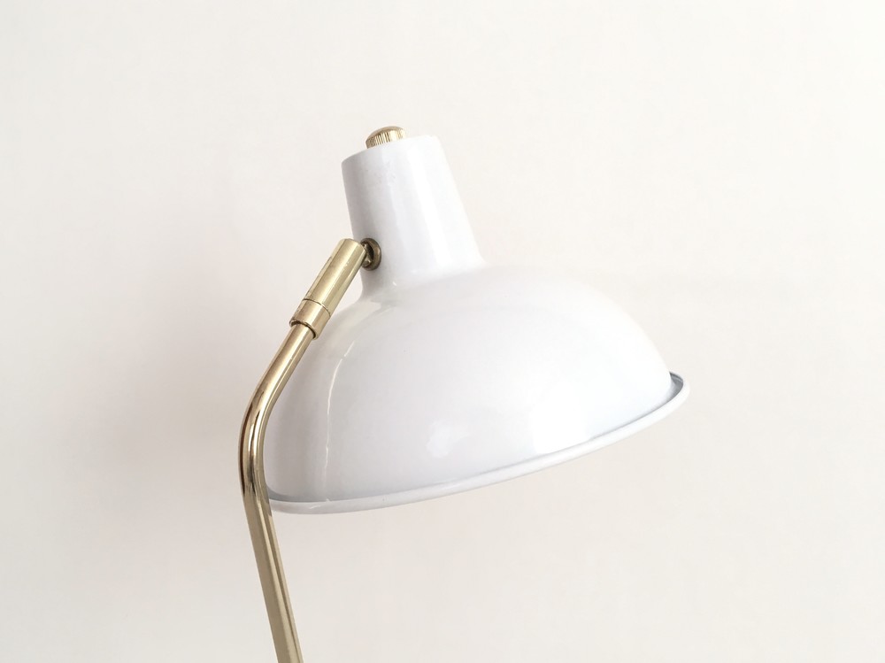 1971년에 영국에서 제작된 테이블램프입니다. 밝은 금색의 파이프와 금속에 에나멜을 입혀 구워낸 법랑을 소재로 만들어진 제품입니다. 오목하고 둥그런 보울모양의 셰이드와 납작한 반구모양의 베이스, 가늘고 기다란- 아주 단순하지만 멋진 실루엣을 가진 파이프가 좋은 균형을 보여줍니다. 자칫 거칠거나 가벼워 보일 수 도 있는 소재와 모양 사이사이에 색감에서 번져나오는 섬세한 분위기들, 각 부분들이 가지고 있는 미묘한 선들이 적당한 무게감을 실어주며 우아하고 세련된 모습을 완성해줍니다. 파이프와 램프셰이드를 연결하는 브릿지부분이 위 아래로 움직일 수 있게되어있어 필요에 따라 빛의 방향을 조절 할 수 있으며, on/off 스위치로 작동되는 제품입니다. 은은한 밝기(15W)의 전구가 사용되는 제품으로 편안한 공기의 침실이나 소파의 한켠에 두기에 잘 어울리며, 책을읽는 테이블이나 식탁위에 두고 적당한 빛을 전해주는 용도로 사용하기에도 알맞습니다.