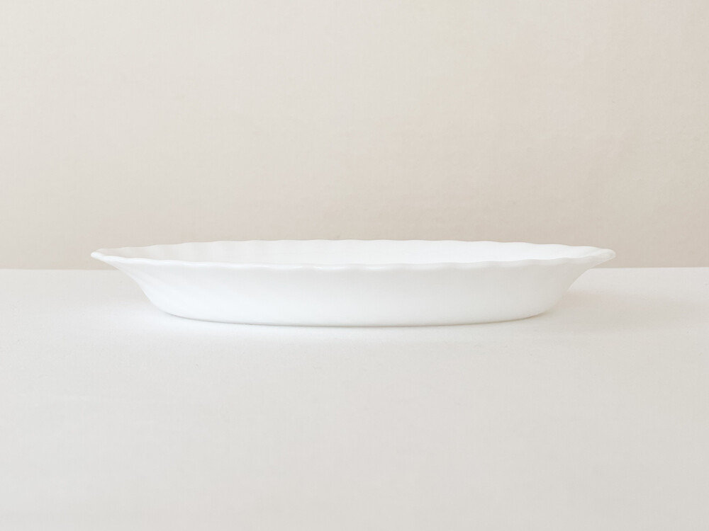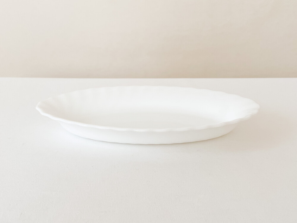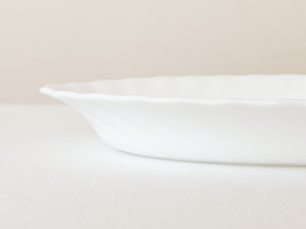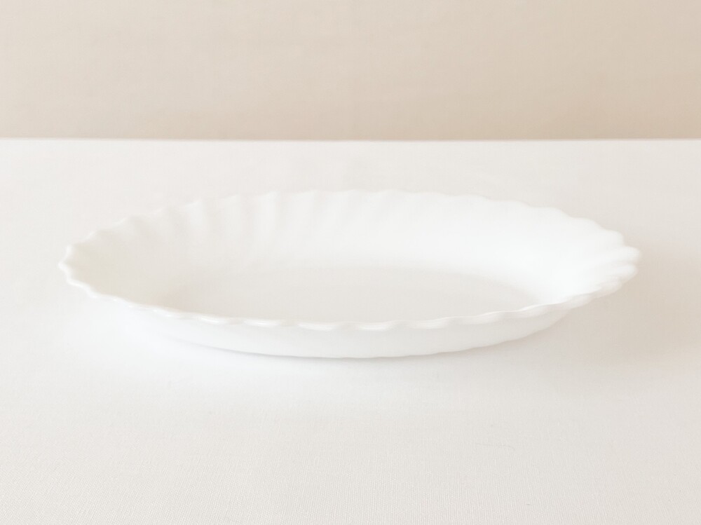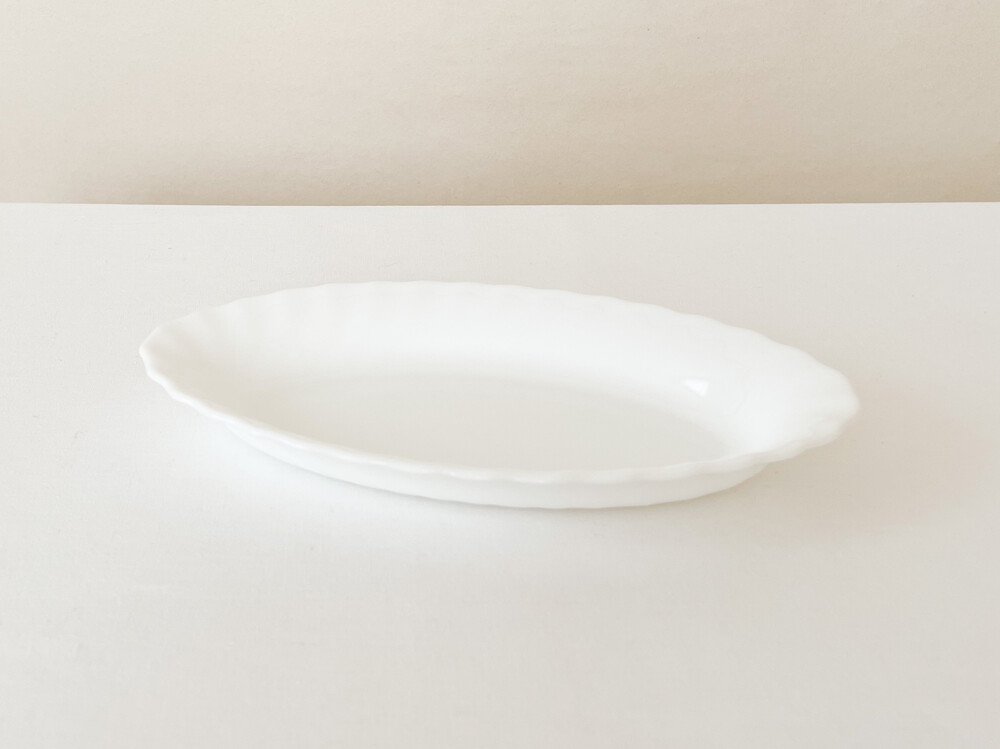 아코팔은 1825년 프랑스 북부의 아르크지방에서 시작된 브랜드입니다. 각 공정의 마스터들이 모여 샴페인잔이나 와인잔같은 스템웨어를 만들며 명성을 쌓아간 아코팔은 아르크 인터네셔널로 브랜드를 확장하며 현재까지도 인기가 있는 워킹글라스를 비롯한 루미낙, 알코록등 적당한 꾸밈을 가진 실용적인 글라스웨어들 제작하였습니다. 소개해드리는 제품은 아코팔에서 처음 만들어진 디자인이며, 1980년대 중후반 아르크 인터네셔널의 이름으로 제작 된 오발디쉬 입니다. 뽀얀 우윳빛의 강화유리를 소재로, 접시와 보울의 중간정도되는 높이를 가지고있어, 여러가지 용도로 편하게 사용하기에 적당합니다. 접시의 가장자리에 장식된- 구름이 흘러가는 모양을 떠올리는 레이스무늬는, 깨끗하고 밝은 소재의 분위기와 잘 어울리는 모습입니다. 아이스크림을 둥글게 올린 따뜻한 파이나, 샌드위치를 나란히 담아내거나- 부엌의 물건을 정돈하는 트레이로 사용하기에 알맞습니다.