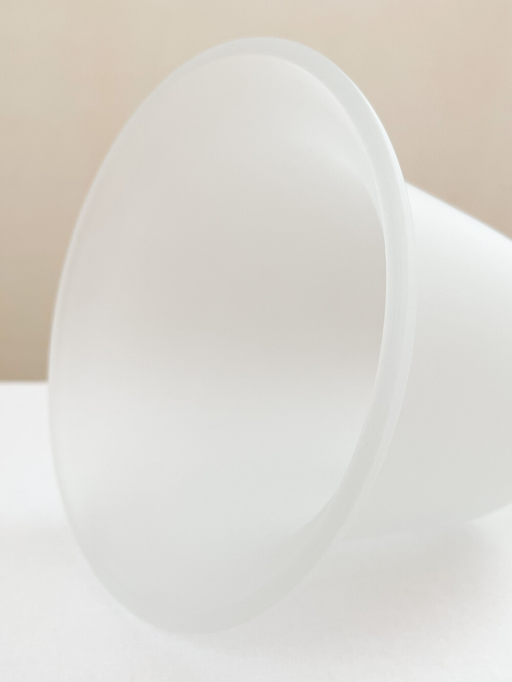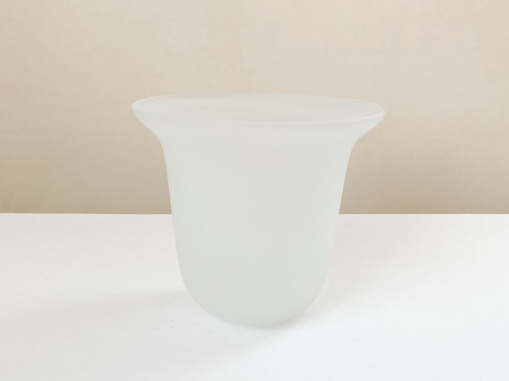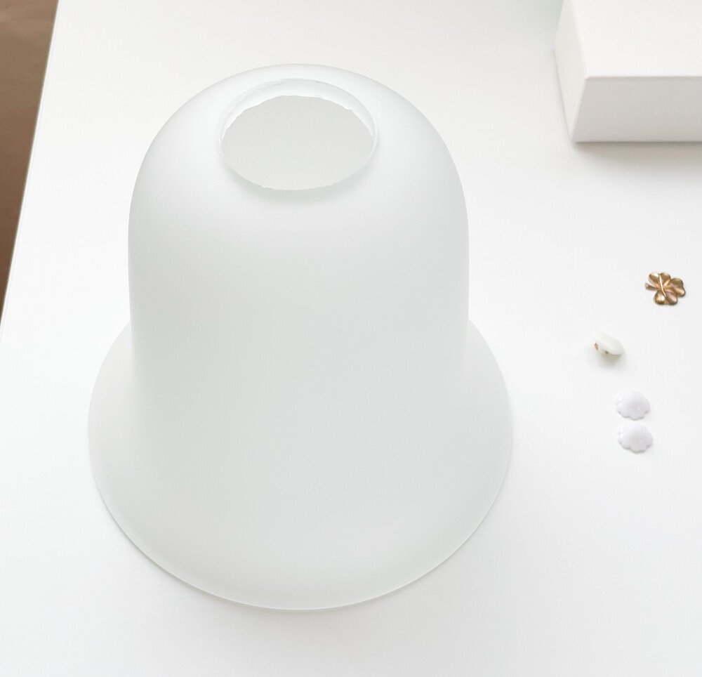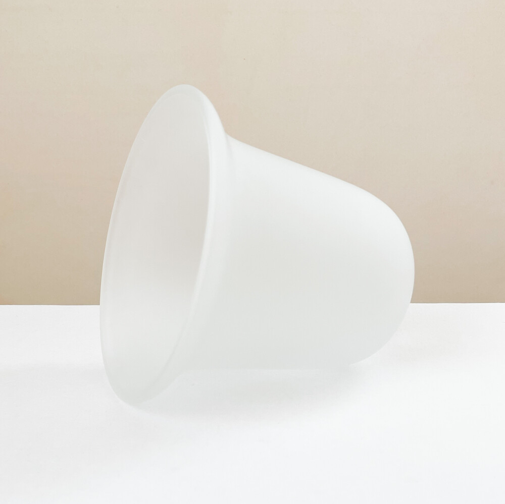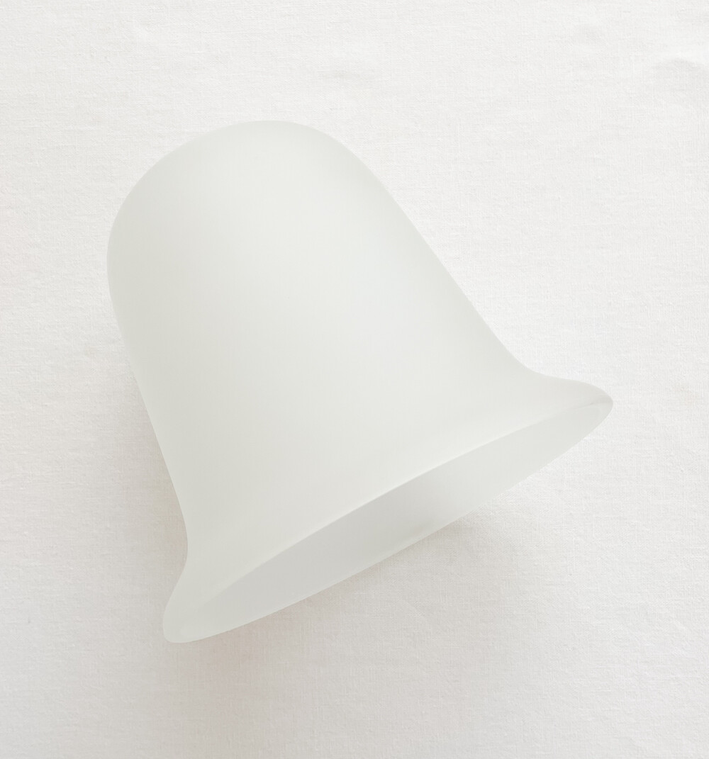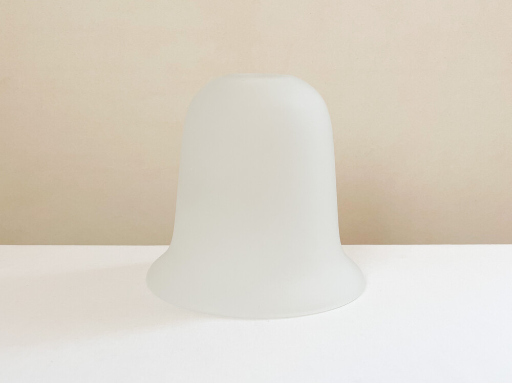 1980년대에 만들어진 램프셰이드입니다. 부드러운 곡선이 돋보이는 벨모양의 셰이드는, 단단하고 보송한 질감을 가진 두터운 유리를 소재로합니다. 깨끗한 흰 구름을 닮은 뽀얀 반투명의 유리는 빛을 부드럽게 머금는 특성을 가지고 있습니다. 소재의 아름다움을 가득 보여주는 담담한 형태와 깨끗한 매무새가 아름답습니다. 따뜻한 색의 전구와 함께 햇살같은 빛을 만들어 내거나, 하얀빛의 전구를 두어 아늑한 공간에 은은한 맑은 빛을 더해주기에 잘 어울립니다.