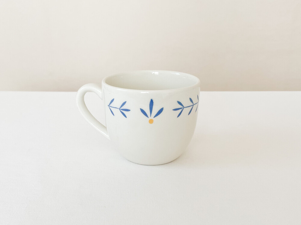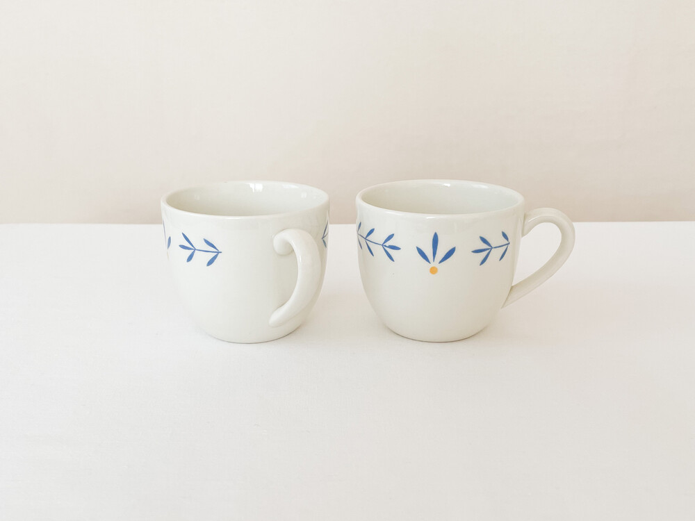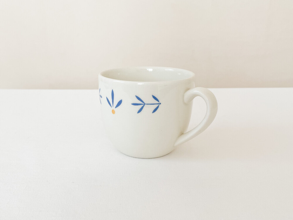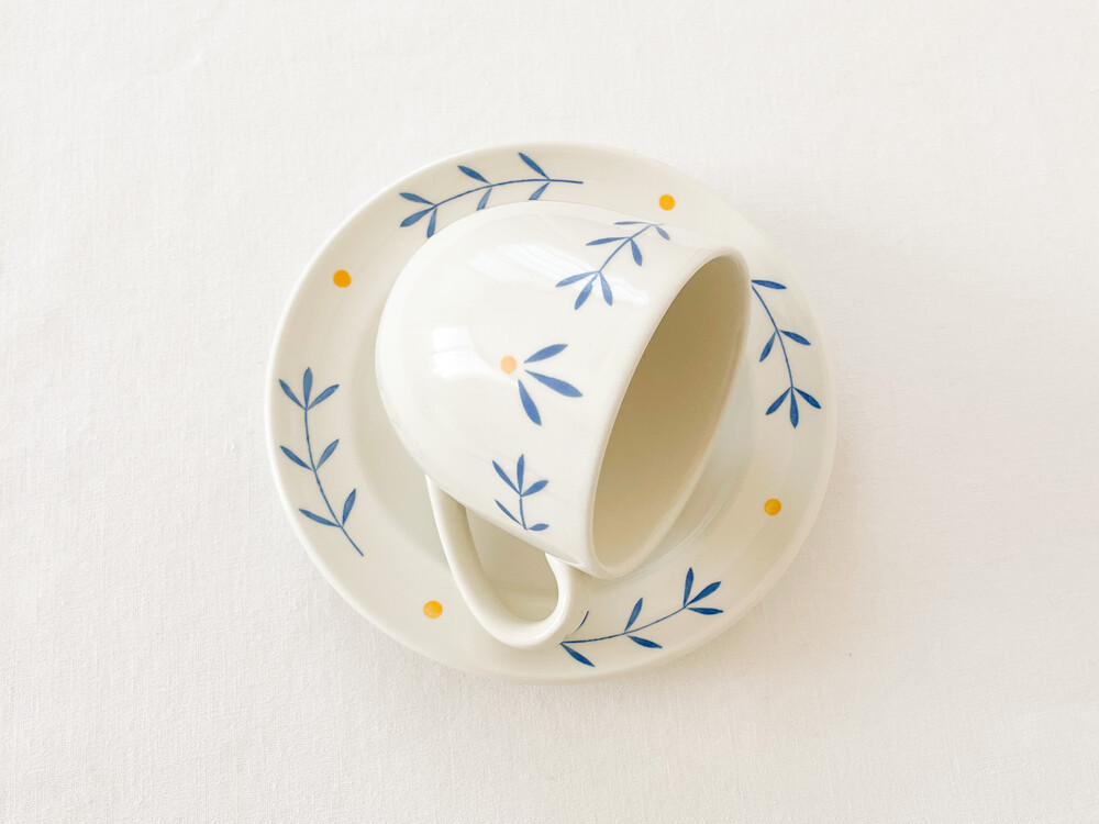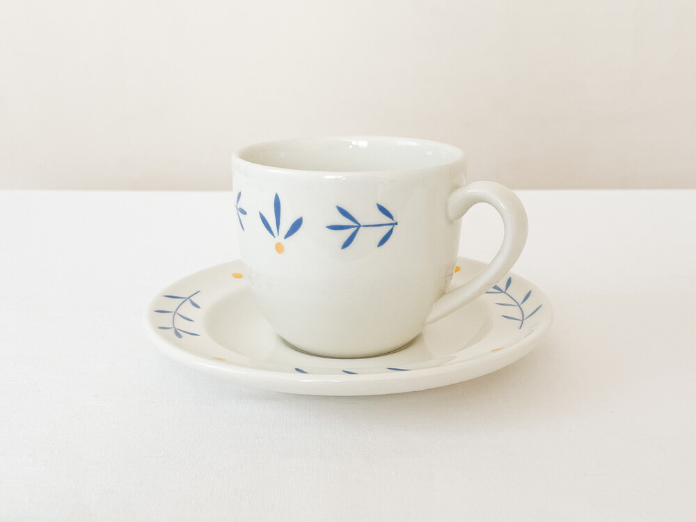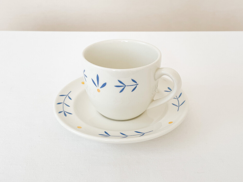 하비타트는 1964년에 설립된 영국의 하우스홀드 브랜드로, 산업디자이너로서 중요한 위치를 가지고있는 콘란에의해 시작 되었습니다. 하비타트라는 이름이 의미하는 것처럼 살아가는데 필요한 여러가지 물건들을 만들어내고있습니다. 미드센츄리디자인과 바우하우스를 기반으로, 보기좋은 디자인과 실용성- 좋은품질과 맥락을 잘 갖춘 적당한 제품들을 제작하며 영국 및 유럽내에서 현재까지도 보편적인 인기를 유지하고 있습니다. 소개해드리는 제품은 1980년대에 하비타트 프랑스를 위해 영국에서 만들어진 코코아잔세트입니다. 하비타트의 테이블웨어에서 자주 보여지는 환한 크림색의 스톤웨어를 소재로 하며, 둥글고 부드러운 실루엣을 가지고 있습니다. 잔의 윗부분과 잔받침의 가장자리에는, 프렌치블루와 선명한 노랑을 사용한 식물무늬가 그려져 있습니다. 소재와 실루엣의 밝고 포근한 정서, 자연을 모티브로한 장식이 조화로우며- 프렌치영화에 나오는 소파테이블에 살짝 놓여있는 편안한 찻잔이 떠오르기도 합니다. 맑고 선선한 계절에 코코아를 마시는 잔으로, 느긋한 오후에 즐거움을 더해주는 디저트 그릇으로 사용하기에 잘 어울립니다.
