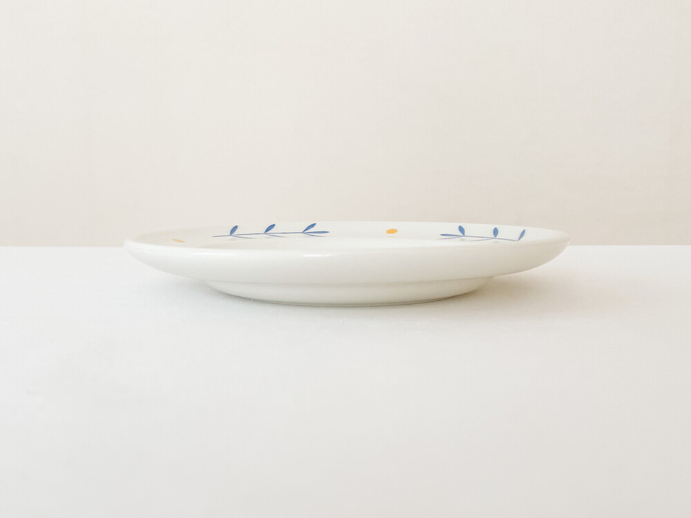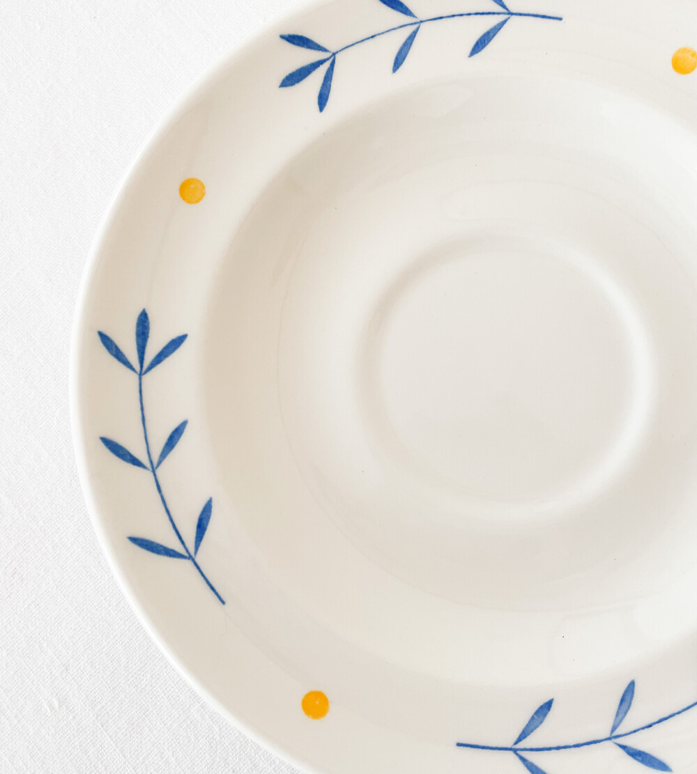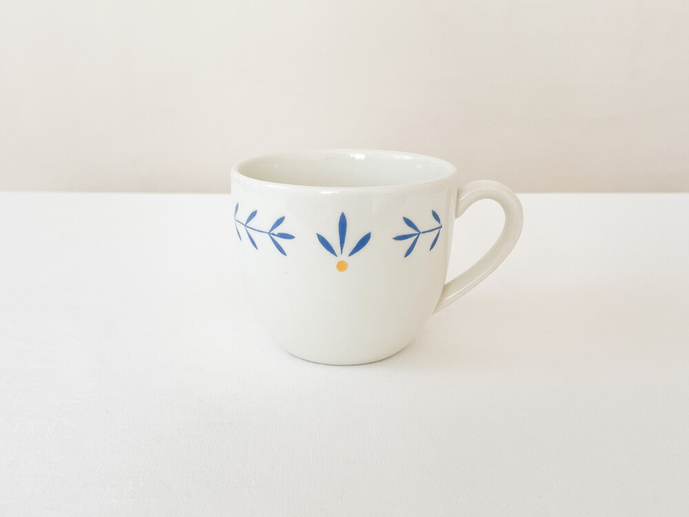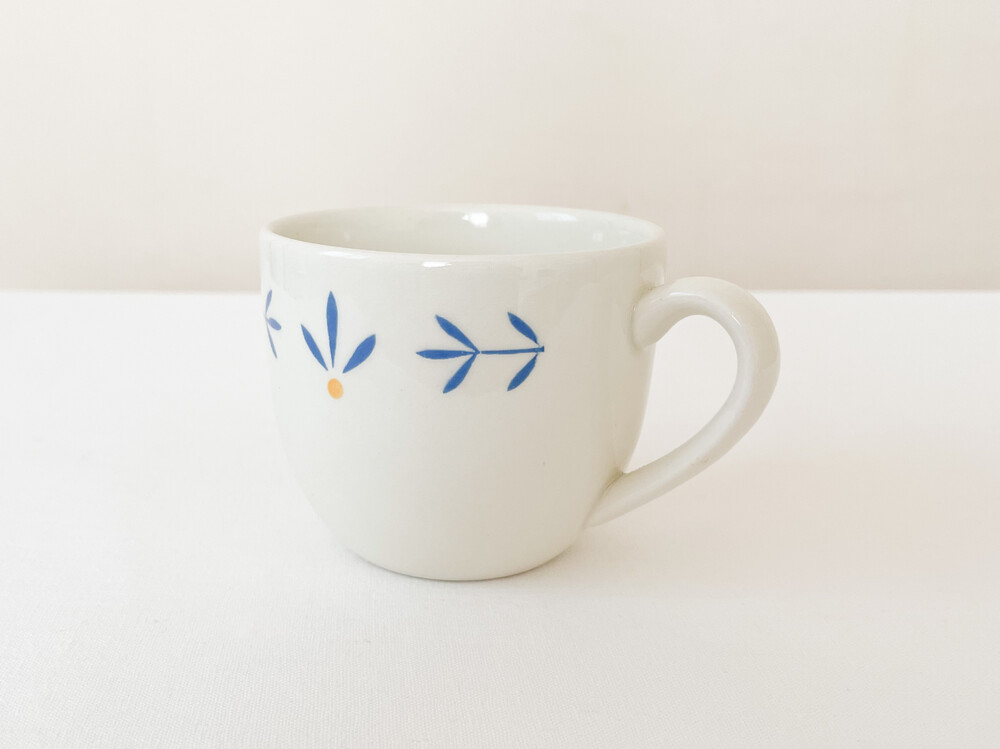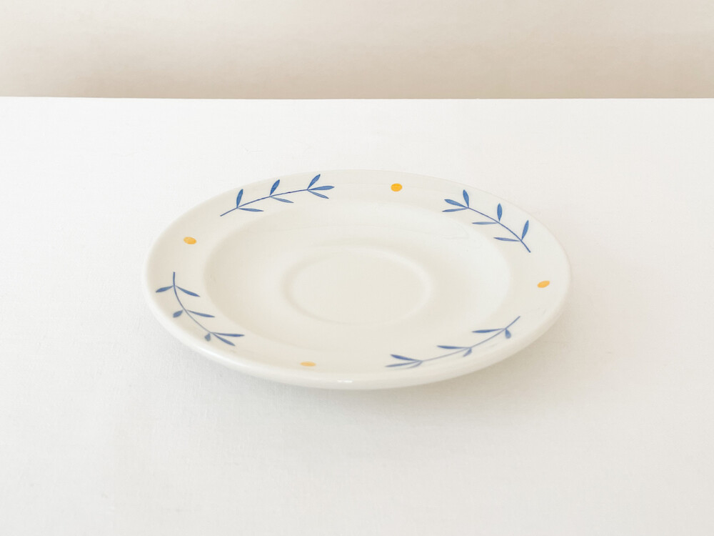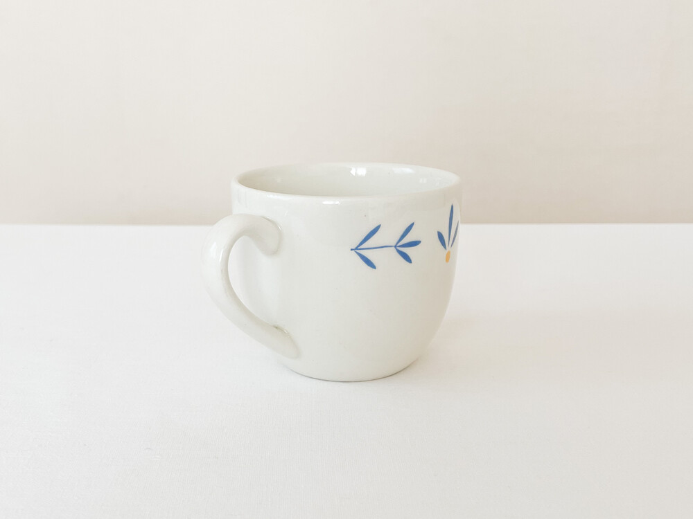 하비타트는 1964년에 설립된 영국의 하우스홀드 브랜드로, 산업디자이너로서 중요한 위치를 가지고있는 콘란에의해 시작 되었습니다. 하비타트라는 이름이 의미하는 것처럼 살아가는데 필요한 여러가지 물건들을 만들어내고있습니다. 미드센츄리디자인과 바우하우스를 기반으로, 보기좋은 디자인과 실용성- 좋은품질과 맥락을 잘 갖춘 적당한 제품들을 제작하며 영국 및 유럽내에서 현재까지도 보편적인 인기를 유지하고 있습니다. 소개해드리는 제품은 1980년대에 하비타트 프랑스를 위해 영국에서 만들어진 코코아잔세트입니다. 하비타트의 테이블웨어에서 자주 보여지는 환한 크림색의 스톤웨어를 소재로 하며, 둥글고 부드러운 실루엣을 가지고 있습니다. 잔의 윗부분과 잔받침의 가장자리에는, 프렌치블루와 선명한 노랑을 사용한 식물무늬가 그려져 있습니다. 소재와 실루엣의 밝고 포근한 정서, 자연을 모티브로한 장식이 조화로우며- 프렌치영화에 나오는 소파테이블에 살짝 놓여있는 편안한 찻잔이 떠오르기도 합니다. 맑고 선선한 계절에 코코아를 마시는 잔으로, 느긋한 오후에 즐거움을 더해주는 디저트 그릇으로 사용하기에 잘 어울립니다.