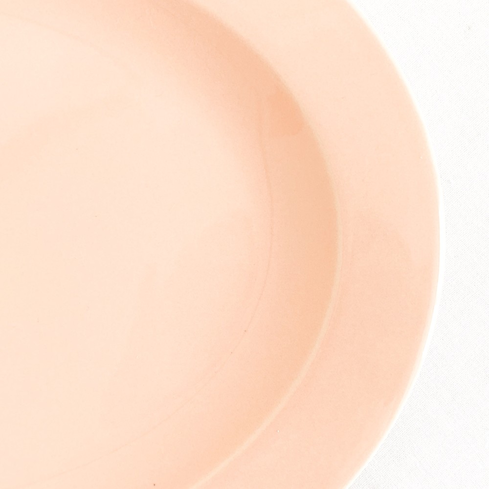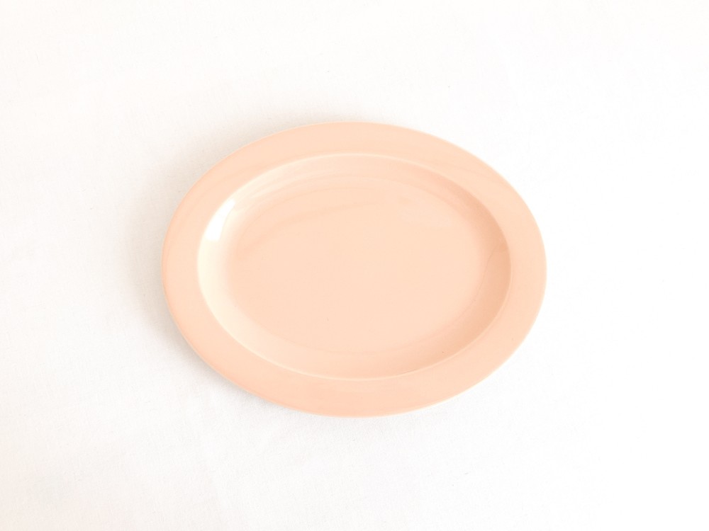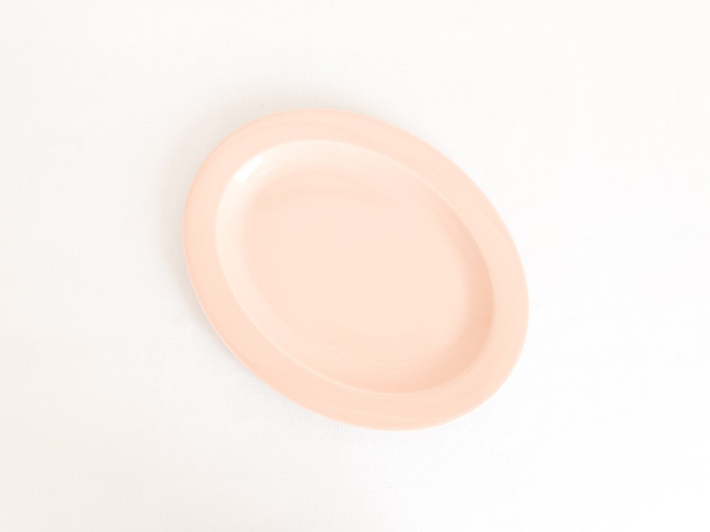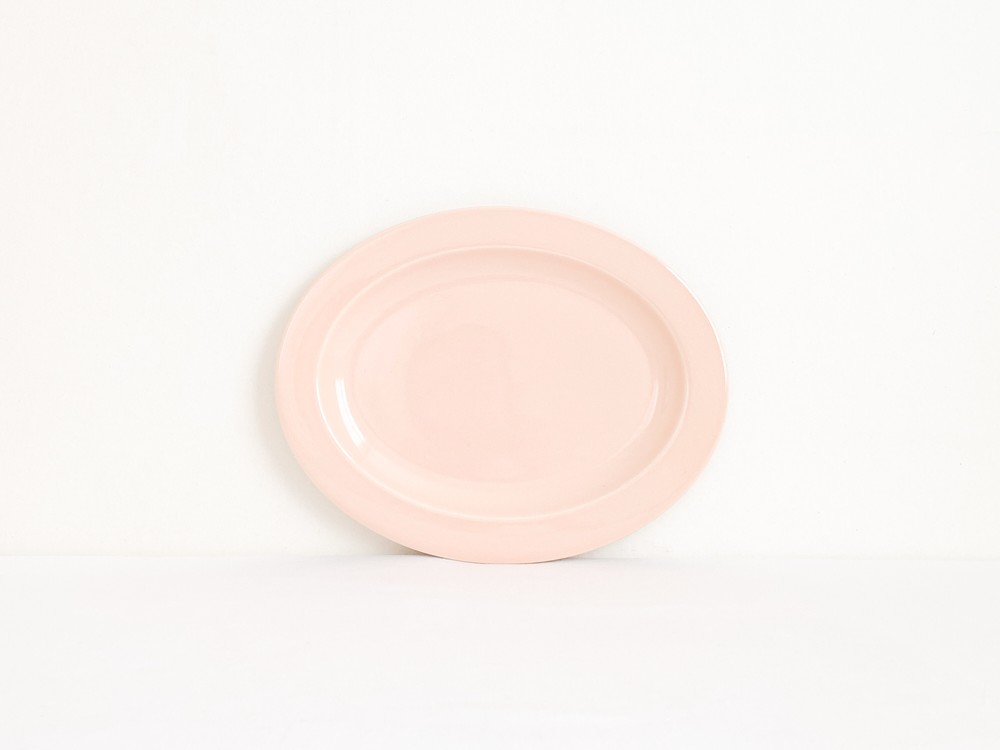 1980년대에 만들어진 혼시의 디너플레이트입니다. 혼시는 1949년부터 잉글랜드 서쪽의 바닷가 마을 혼시에서, 해변의 기념품이 될만한 도자기인형이나 화병을 제작하던 하우스 브랜드 입니다. 좋은 재료, 좋은 디자인으로 유명세를 가지게되며 1950년부터 테이블웨어를 생산하기 시작했습니다. 매뉴팩쳐와 아트피스사이의 적당한 지점을 찾아보고자 했던 혼시는 예술대학 학생들을 디자이너로 영입하고, '현대적인 우아함' 그리고 '정원에서 보내는 차마시는 시간'을 모티브로한 세련된 제품들을 만들었습니다. 그에 걸맞는 멋진 테이블웨어들은 영국의 주요 박물관에서도 소장하고 있을 만큼 높은 가치가 유지되고 있습니다. 소개해드리는 넓은 타원형의 접시는 안정적인 도톰한 두께와 안정감있는 묵짐함을 가진 크림색의 스톤웨어를 소재로 만들어졌으며, 겉면에 포근한 복숭아빛이 고르게 입혀져있습니다. 색과 모양, 질감의 조화로움이 전해주는 따스하고 차분한 분위기가 전해집니다. 정성스래 준비한 음식과 이야기를 나누는 둘러앉은 식탁위의 그릇으로 사용하기에 잘어울리며- 단정한 찻잔과 커틀러리, 그리고 작은 디저트를 함께 담아내는 티트레이로 사용하기에도 알맞습니다.