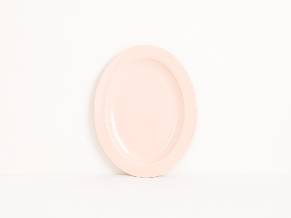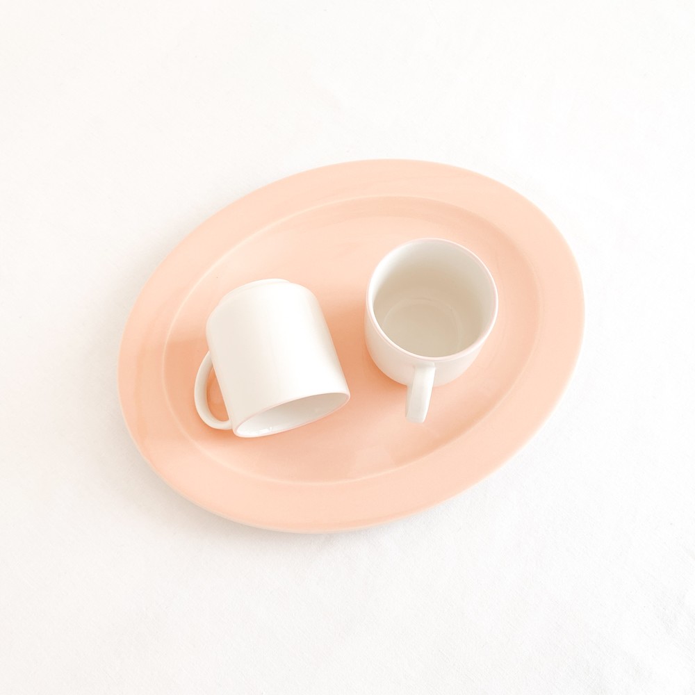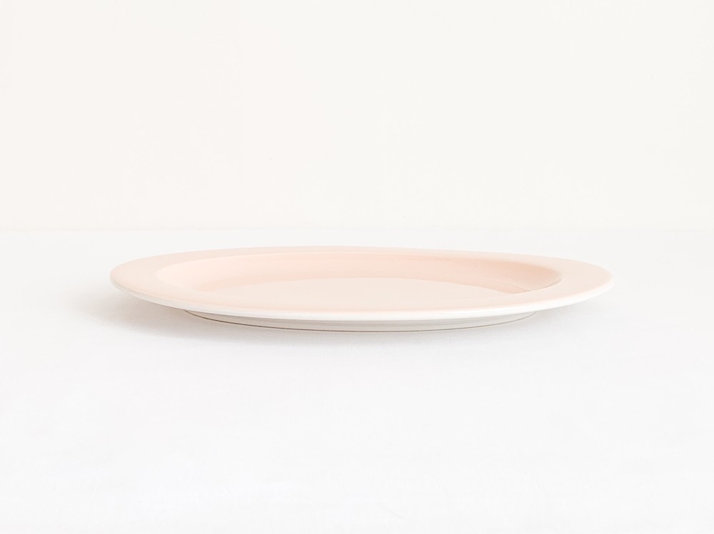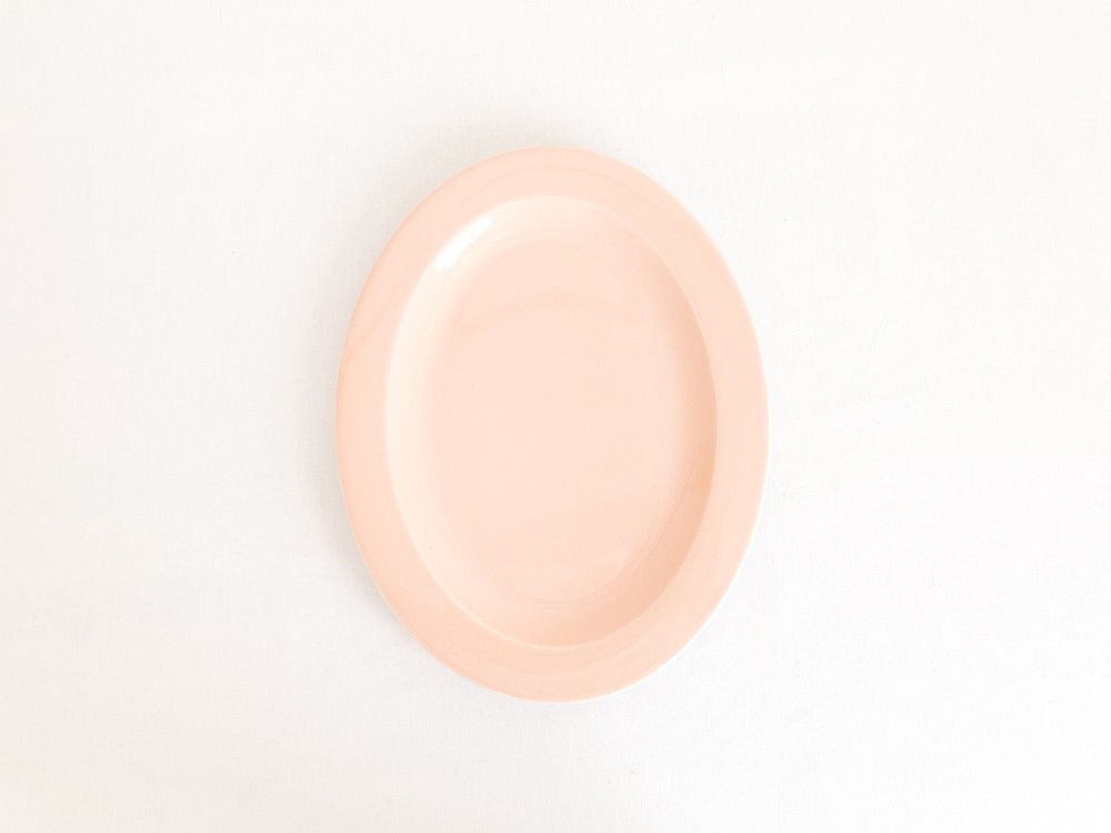 1980년대에 만들어진 혼시의 디너플레이트입니다. 혼시는 1949년부터 잉글랜드 서쪽의 바닷가 마을 혼시에서, 해변의 기념품이 될만한 도자기인형이나 화병을 제작하던 하우스 브랜드 입니다. 좋은 재료, 좋은 디자인으로 유명세를 가지게되며 1950년부터 테이블웨어를 생산하기 시작했습니다. 매뉴팩쳐와 아트피스사이의 적당한 지점을 찾아보고자 했던 혼시는 예술대학 학생들을 디자이너로 영입하고, '현대적인 우아함' 그리고 '정원에서 보내는 차마시는 시간'을 모티브로한 세련된 제품들을 만들었습니다. 그에 걸맞는 멋진 테이블웨어들은 영국의 주요 박물관에서도 소장하고 있을 만큼 높은 가치가 유지되고 있습니다. 소개해드리는 넓은 타원형의 접시는 안정적인 도톰한 두께와 안정감있는 묵짐함을 가진 크림색의 스톤웨어를 소재로 만들어졌으며, 겉면에 포근한 복숭아빛이 고르게 입혀져있습니다. 색과 모양, 질감의 조화로움이 전해주는 따스하고 차분한 분위기가 전해집니다. 정성스래 준비한 음식과 이야기를 나누는 둘러앉은 식탁위의 그릇으로 사용하기에 잘어울리며- 단정한 찻잔과 커틀러리, 그리고 작은 디저트를 함께 담아내는 티트레이로 사용하기에도 알맞습니다.