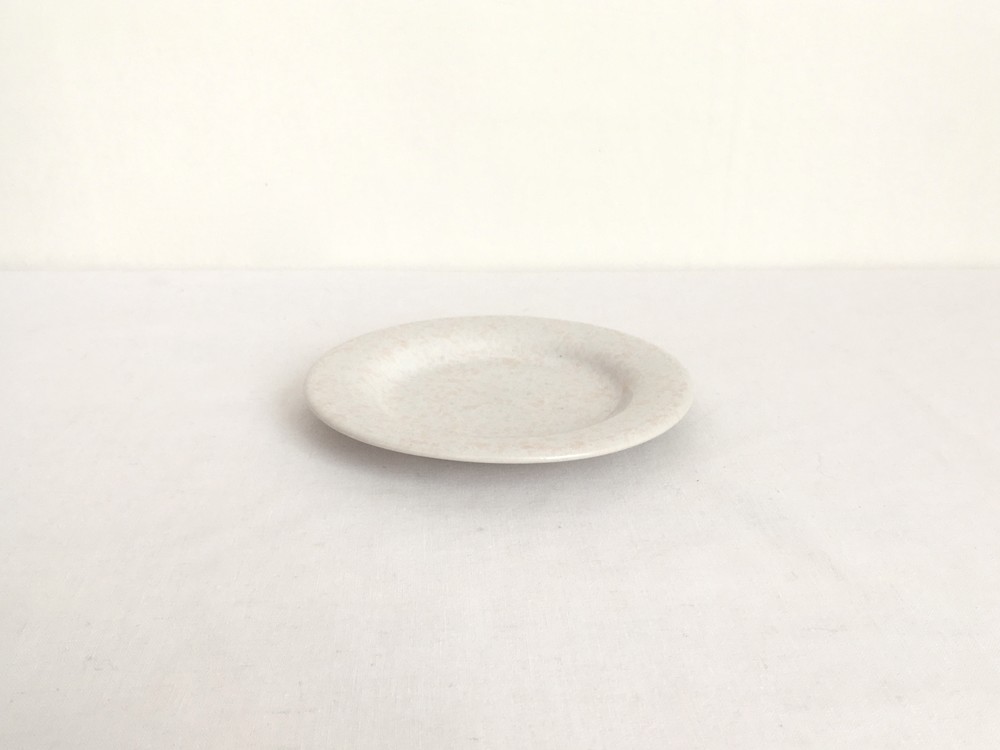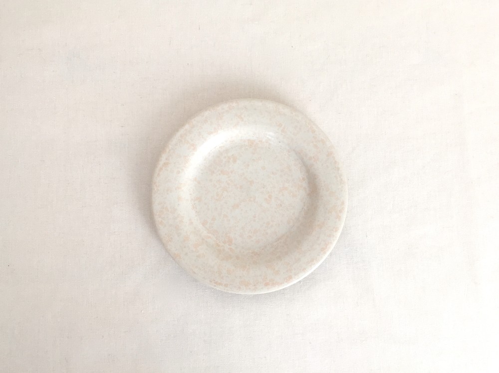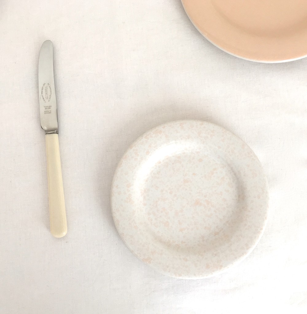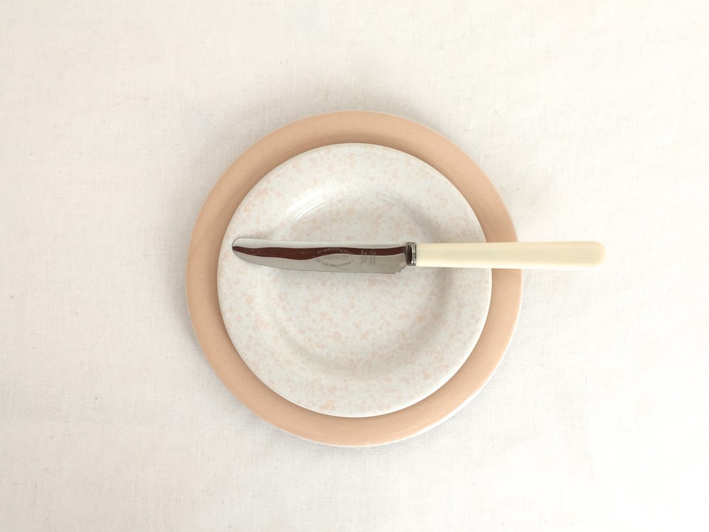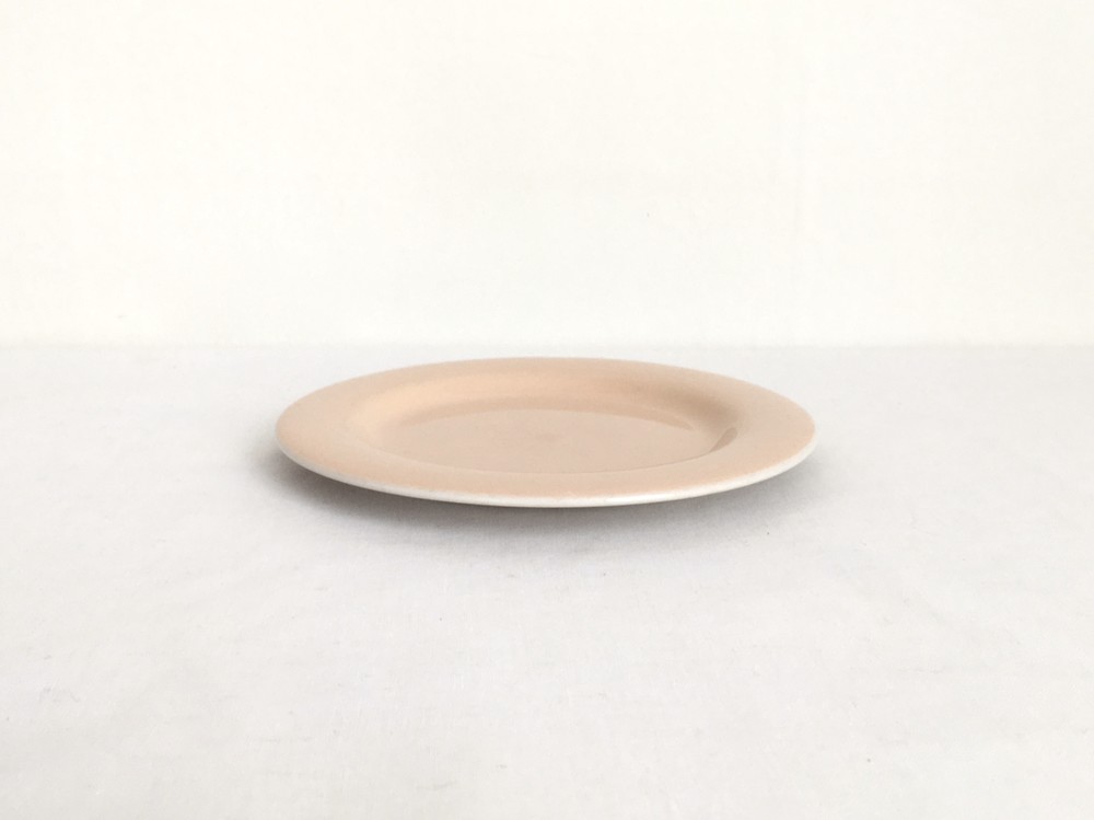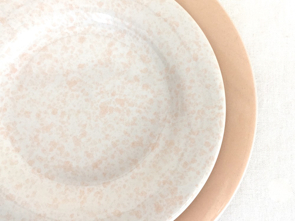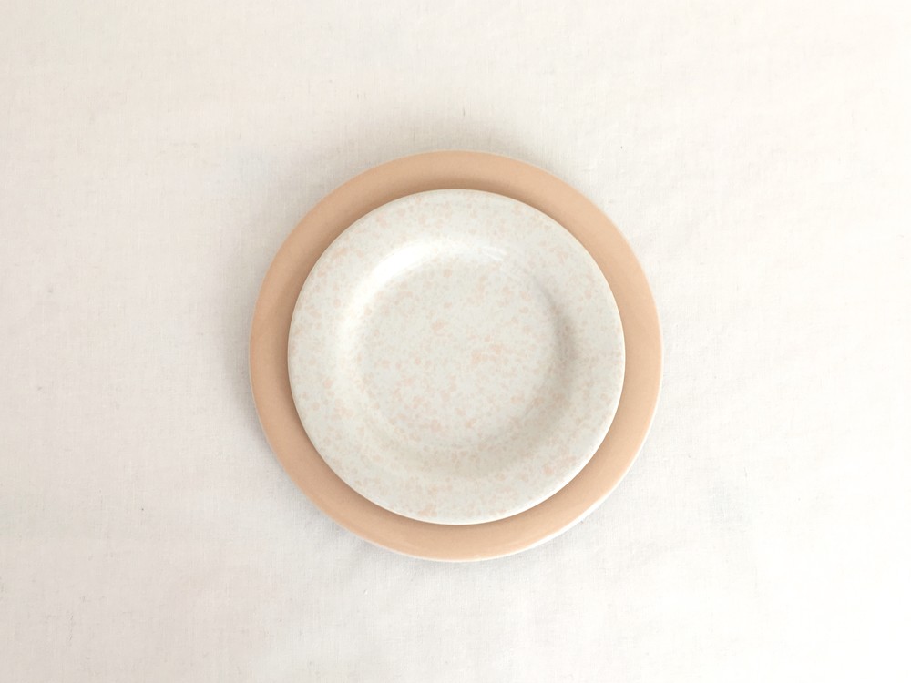 1980년대에 만들어진 혼시의 플레이트입니다. 혼시는 1949년부터 잉글랜드 서쪽의 바닷가 마을 혼시에서, 해변의 기념품이 될만한 도자기인형이나 화병을 제작하던 하우스 브랜드 입니다. 좋은 재료, 좋은 디자인으로 유명세를 가지게되며 1950년부터 테이블웨어를 생산하기 시작했습니다. 매뉴팩쳐와 아트피스사이의 적당한 지점을 찾아보고자 했던 혼시는 예술대학 학생들을 디자이너로 영입하고, '현대적인 우아함' 그리고 '정원에서 보내는 차마시는 시간'을 모티브로한 세련된 제품들을 만들어내던 포터리입니다. 그 모티브에 걸맞는 멋진 테이블웨어들은 영국의 주요 박물관에서도 소장하고 있을 만큼 높은 가치가 유지되고 있습니다. 소개해드리는 접시는 안정적인 도톰한 두께와 적당한 묵직함을 가진 스톤웨어를 소재로 합니다. 같은 흐름을 가지고 있는, 두가지 크기와 무늬의 접시가 하나의 세트로 구성된 제품입니다. 작은 크기의 접시는 크림색 도자기를 바탕으로 복숭아빛 마틀드패턴(불규칙한 얼룩무늬)이 입혀져있으며, 조금 더 넓직한 크기의 접시는 작은접시의 무늬에 사용된 것과 같은 계열의 복숭아빛이 접시의 윗면에 매끄럽게 입혀져 있습니다. 포근하고 따스한, 기분좋은 밝음을 간직하고 있습니다. 따뜻한 음식을 담아 천천히 보내는 식사시간을 위해 두 개의 접시를 겹쳐내어 사용하기에 알맞으며, 좋은 빵과 버터 - 달걀요리를 한 접시에 담아내는 아침식사용 그릇 또는 예쁘고 달콤한 디저트를 담는 그릇으로도 잘 어울립니다.
