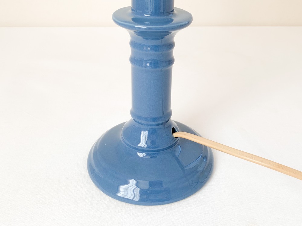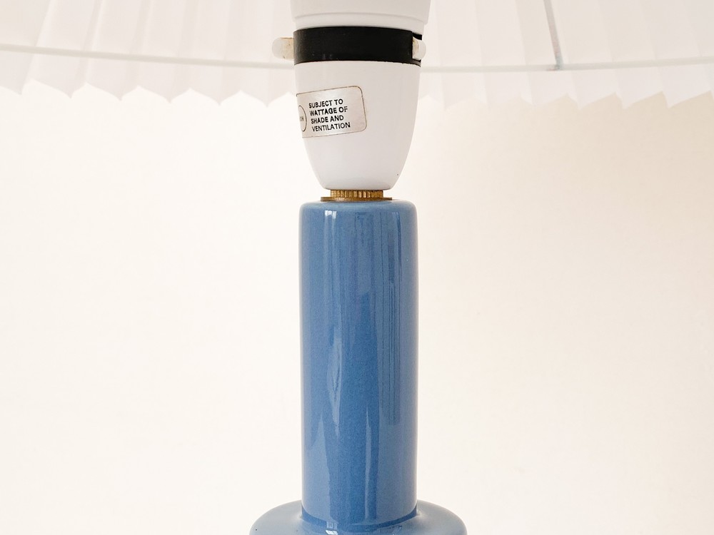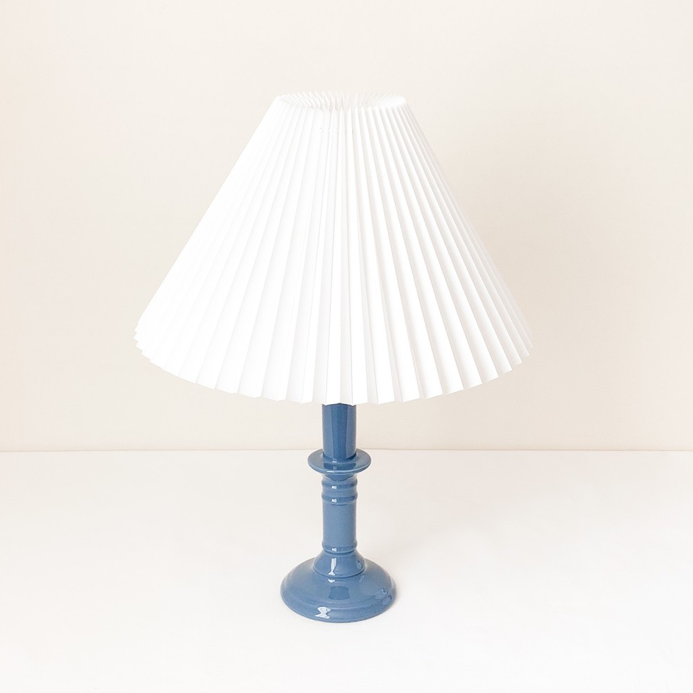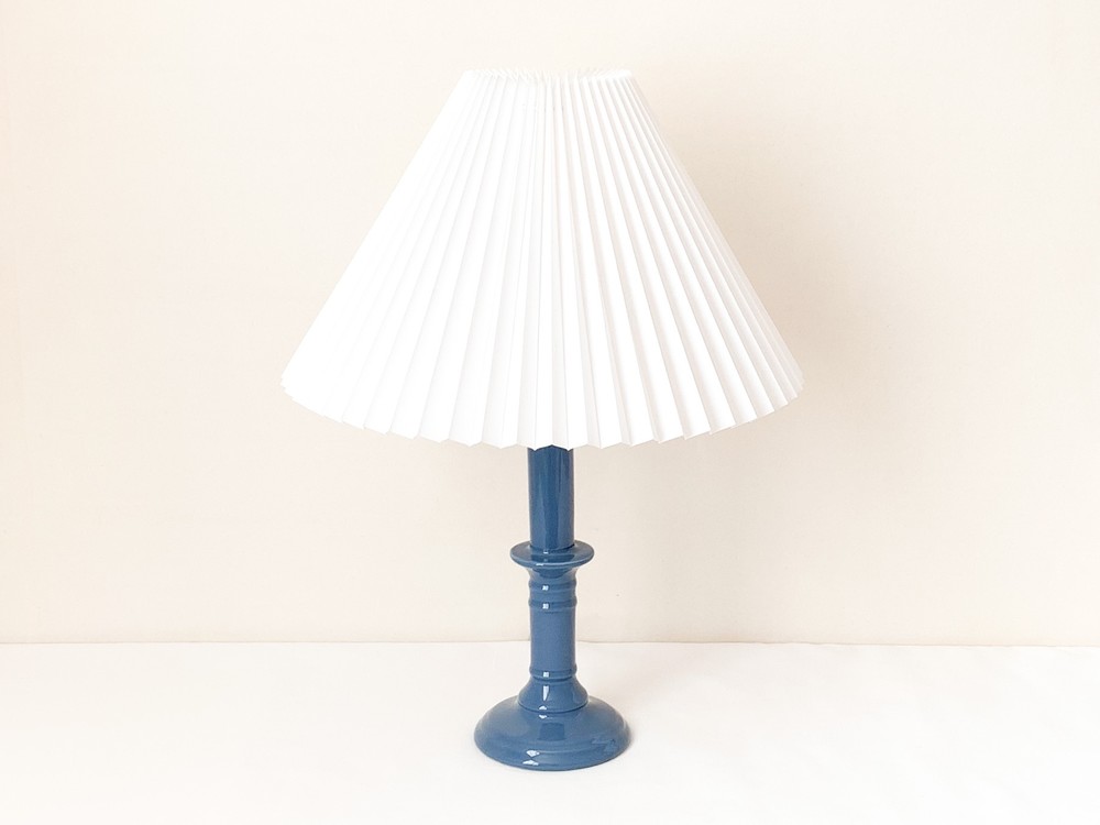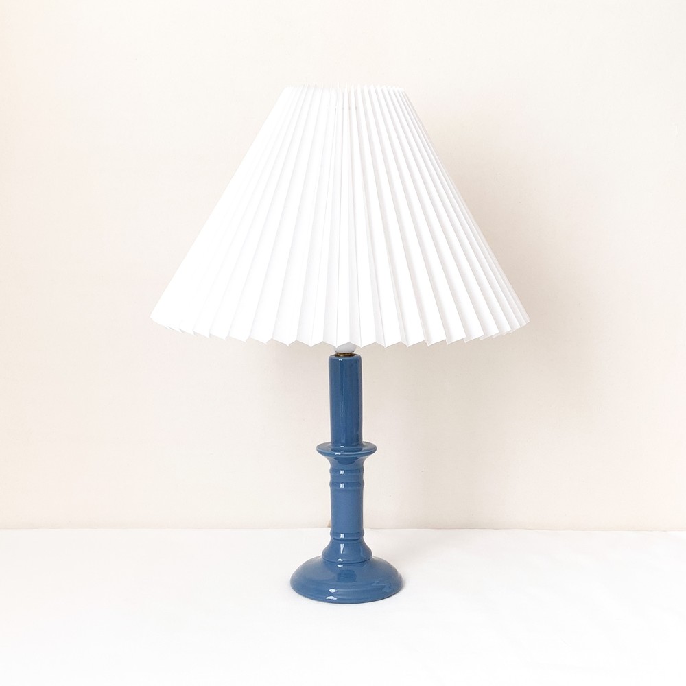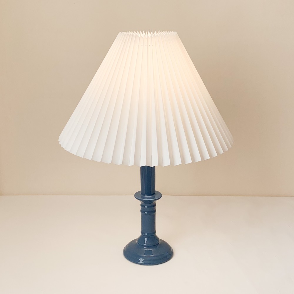 1980년대 덴마크에서 제작된 빈티지 테이블램프입니다. 차분하고 담담한 파랑의 세라믹베이스와 깨끗한 하얀색의- 얇은 아크릴셰이드를 소재로한 셰이드로 구성되어있습니다. 캔들스틱을 모티브로 만들어진 베이스는 단정하고 우아한 실루엣을 가지고있으며, 가지런한 리듬으로 펼쳐진 플리츠 셰이드와 아름다운 조화를 보여줍니다. 램프를 작동하는데에 필요한 부분들은 국내에서 안전하게 사용할 수 있는 인증을 마치고 수리가 되었습니다. 램프에 불을 켰을때에는 따스한 빛이 셰이드안에 고르게 펼쳐져, 팔랑이듯 은은한 반짝임을 전해줍니다. 공간을 환한 분위기로 꾸며주는 오브제로, 쉬는시간을 위한 편안한 공간의 조명으로 잘어울립니다.