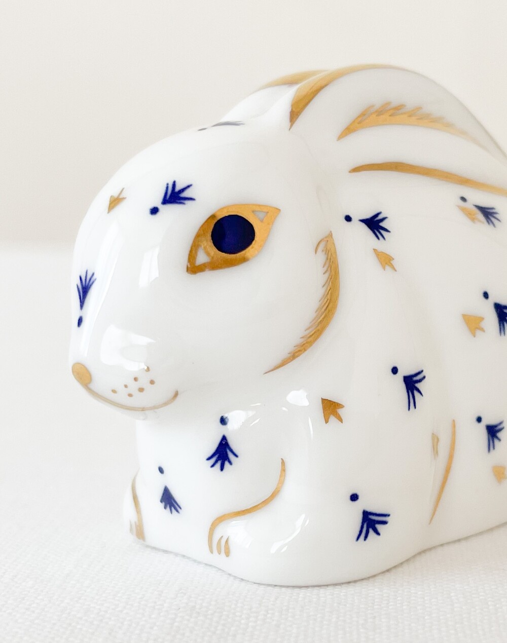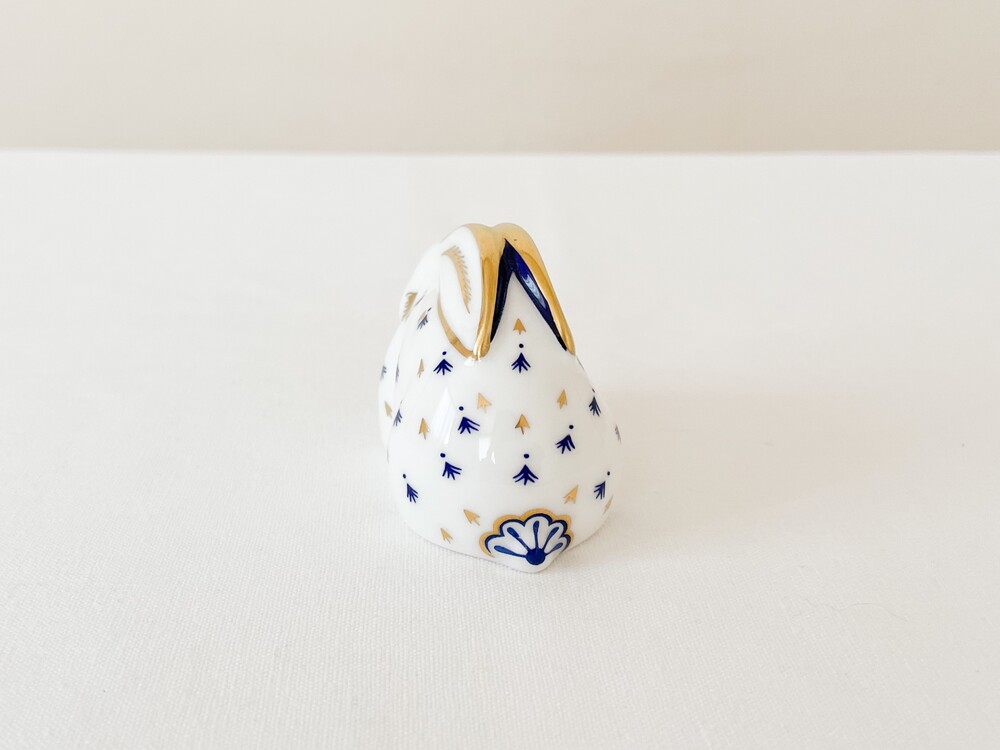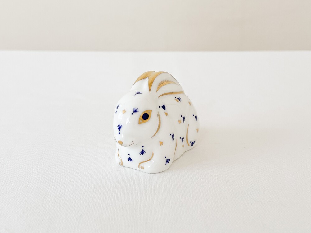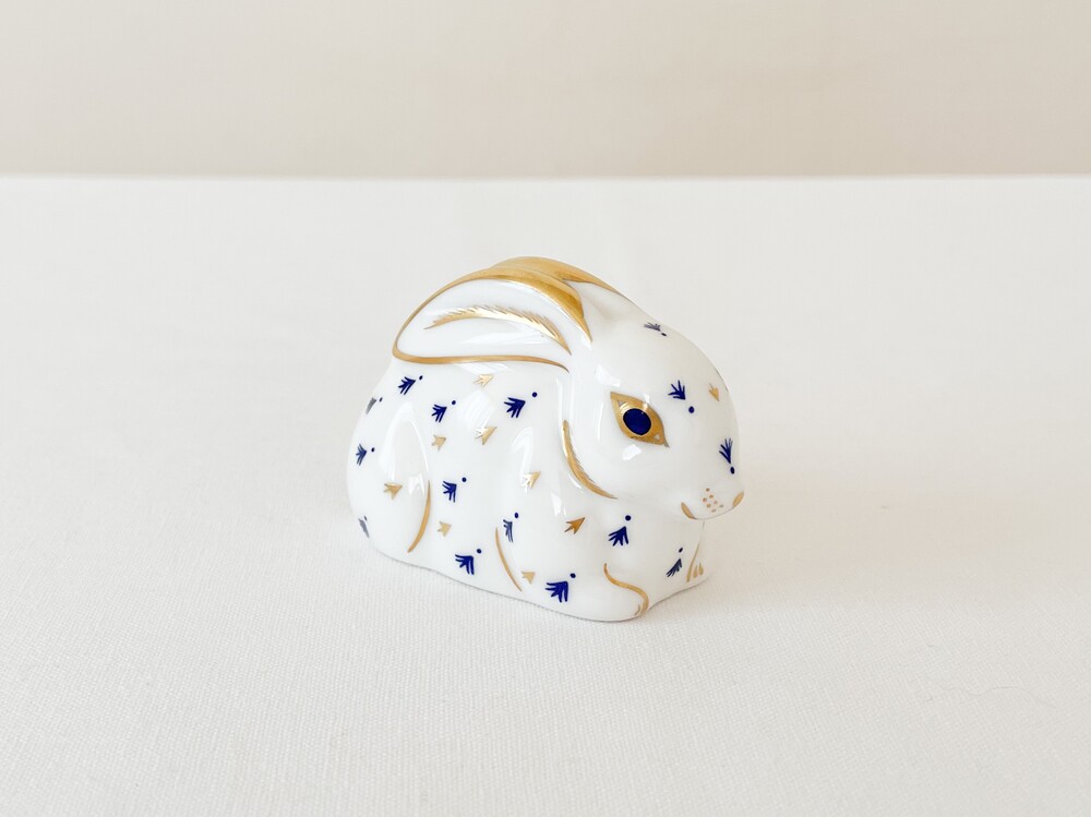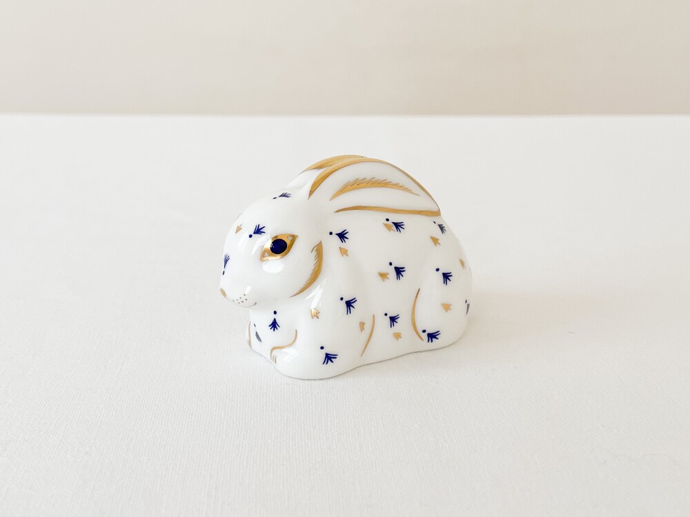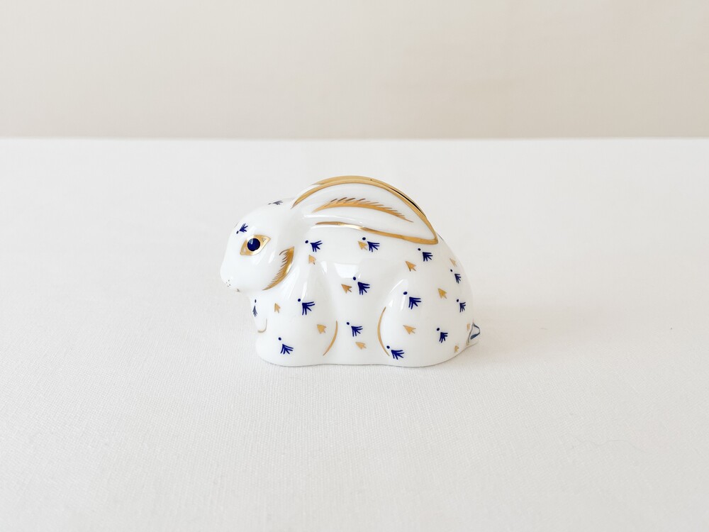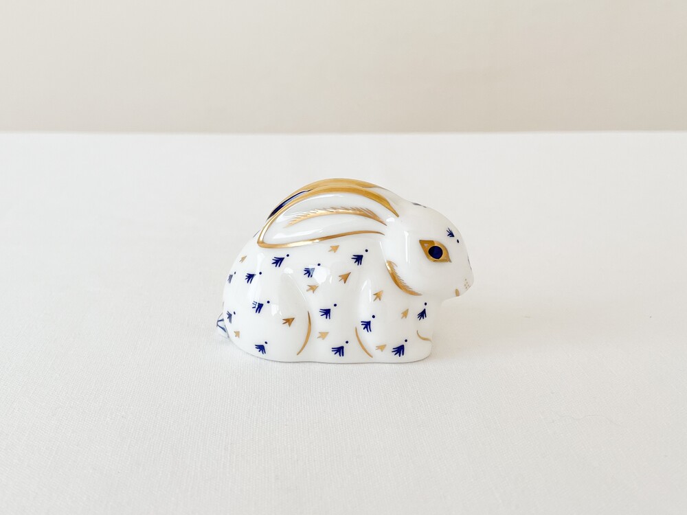로얄 크라운 더비는, 1750년 잉글랜드 더비지역에서 더비 포셀린이라는 이름으로 시작 된 포셀린-본차이나 브랜드 입니다. 성과 박물관을 위한 장식품, 섬세한 티웨어를 주로 만들었으며 18세기에 시작 된 많은 포셀린 브랜드의 전신이 되기도 합니다. 전통이 바탕이 되는 좋은 품질의 제품들과 앞으로를 위한 아카데믹한 노력들을 토대로- 더비 포셀린 앞에 크라운, 로얄 같은 워런티를 나타내는 이름을 하나씩 더하게 되며 시간의 흐름과 함께 브랜드의 위치는 더욱 견고해 집니다. 더비의 도자기들은 지금에도 수집가들의 훌륭한 수집품이 되는 브랜드이자, 곳곳의 장식미술을 다루는 박물관의 중요한 소장품이기도 합니다. 소개해드리는 제품은 더비의 100주년을 기념으로 만들어진 1800년대의 제품을 1980년대에 한정 된 수량의 기념품으로 제작한 페이퍼웨이트 입니다. 살포시 앉아있는 작은 토끼의 모습을 모티브로 하며, 더비고유의 맑고 새하얀 포셀린이 소재로 사용되었습니다. 부드럽고 둥근- 매끄러운 굴곡들이 모티브와 무척 잘 어울립니다. 로얄블루와 22k 골드를 사용해 토끼의 표정과 작은 부분들을 묘사하고, 식물과 꽃가지에서 영감을 얻은 패턴들을 적당한 간격으로 놓아 장식했습니다. 밝고 귀여운 모티브와 꾸밈에 사용 된 우아한 색감과 고전적인 소재의 어울림이 무척 아름답습니다. 가벼운 종이나 부엌의 클로스를 정돈하는 용도로, 공간을 장식하는 오브제로 놓아두기에 잘 어울립니다.