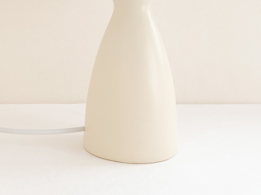하비타트는 1964년에 설립된 영국의 하우스홀드 브랜드로, 산업디자이너로서 중요한 위치를 가지고있는 콘란에의해 시작 되었습니다. 하비타트라는 이름이 의미하는 것처럼 살아가는데 필요한 여러가지 물건들을 만들어내고있습니다. 미드센츄리디자인과 바우하우스를 기반으로, 보기좋은 디자인과 실용성- 좋은품질과 맥락을 잘 갖춘 적당한 제품들을 제작하며 영국 및 유럽내에서 현재까지도 보편적인 인기를 유지하고 있습니다. 소개해드리는 제품은 1987년에 제작된 세락믹베이스의램프 입니다. 밝은 베이지와 크림색의 중간즈음 되는- 따스한 질감의 스톤웨어 베이스는 날씬한 화병을 떠올리는 섬세한 실루엣을 가지고 있으며, 탄성이있는 아크릴을 소재로한 넉넉한 크기의 새하얀 셰이드는 소재의 사뿐함과 깨끗한 색감의 조화로 세련된 분위기를 완성해줍니다. 램프의 작동에 필요한 플러그와 전선과 스위치는 국내에서 안전하게 사용할 수 있도록 인증이 된 제품으로 수리가 완료되었으며, 소켓은 빈티지 고유의 것이 그대로 사용되었습니다. 불을 켰을때에는 셰이드의 가지런한 결을 따라 고르게 펼쳐지는 빛의 흐름이 보여집니다. 쉬는시간을 보내는 테이블 곁의 차분한 조명으로, 침실의 한켠에 두어 편안한 공기를 채워주는 오브제로 사용하기에 잘 어울립니다.