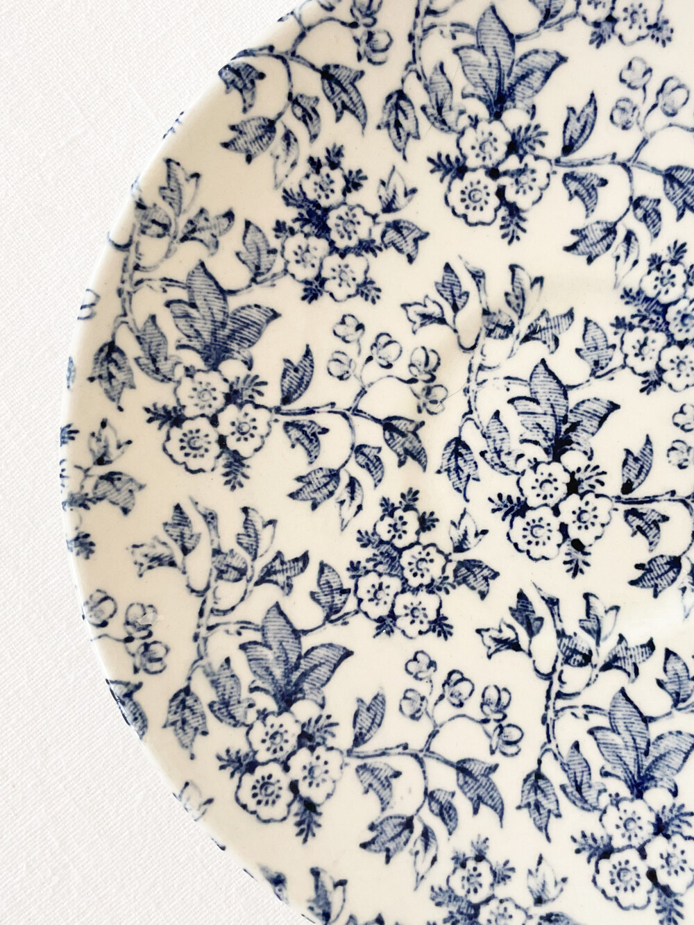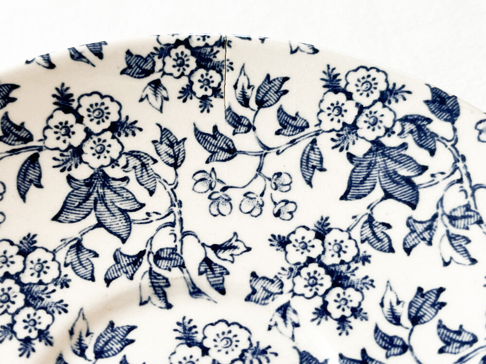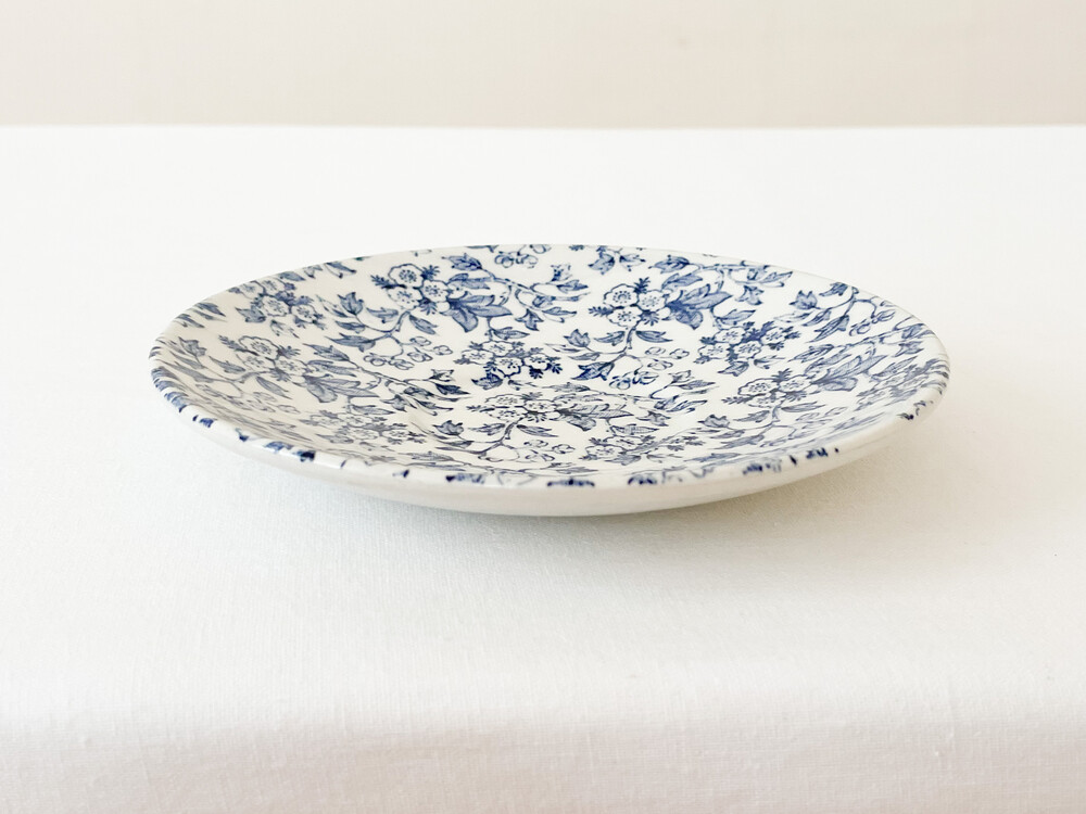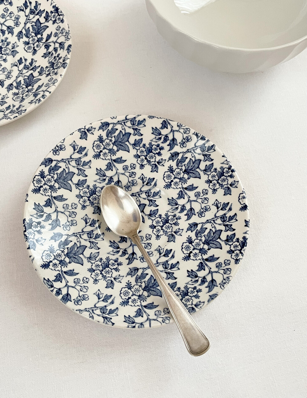 소개해드리는 제품은 1958년의 것으로 전해지는 찻잔받침입니다. 도톰하고 단정한 선을 가지고 있으며, 섬세한 무늬를 표현 할 수 있는 트랜스퍼프린트를 사용하여 겉면에 잔잔한 꽃무늬를 입혀냈습니다. 선명한 푸른색의 꽃무늬는 바탕이 되는 밝은 크림색이 도자기와 아름다운 조화를 이루며, 밝고 보드라운 계절의 정서를 전해줍니다. 깨끗한 분위기의 컵과 함께 사용하는 잔받침으로, 잼쿠키나 파이를 담아내는 디저트 그릇으로 사용하기에 잘 어울립니다.