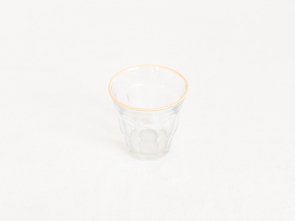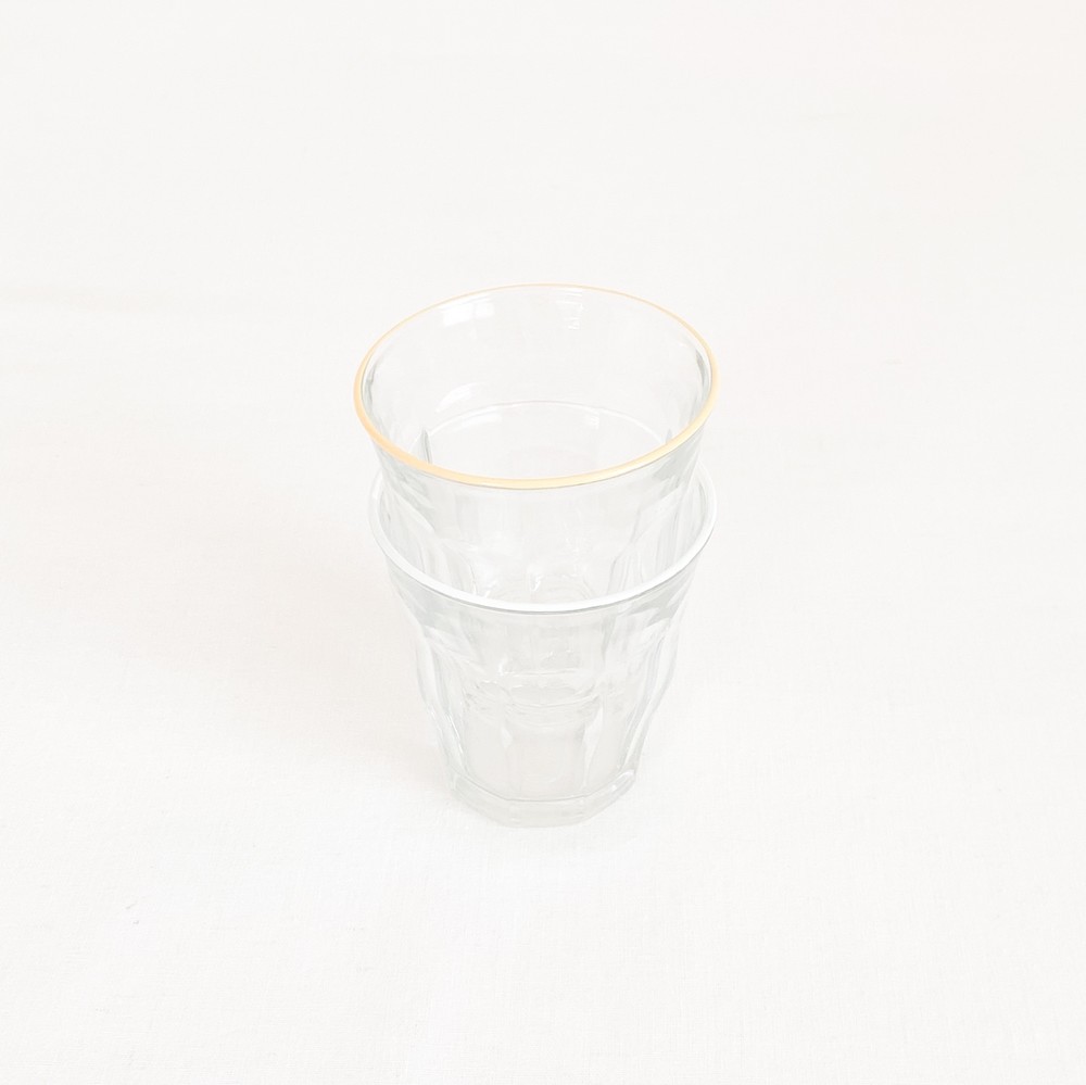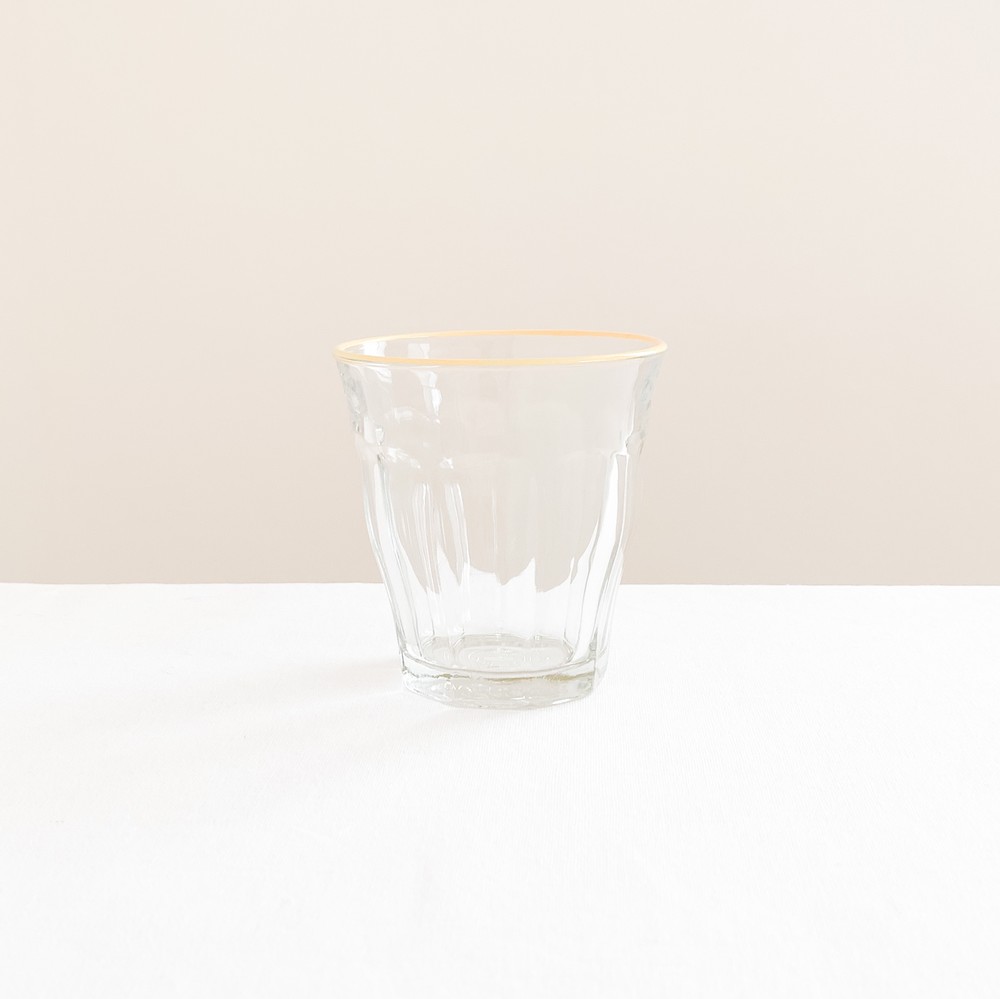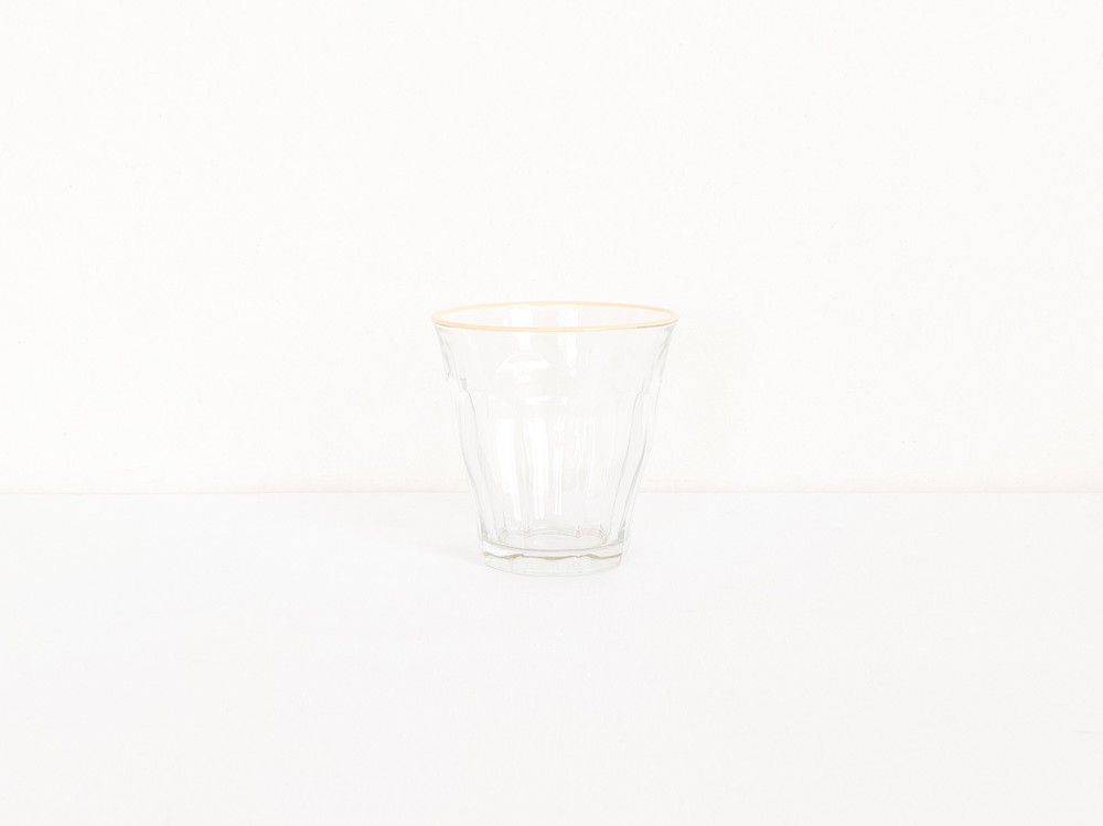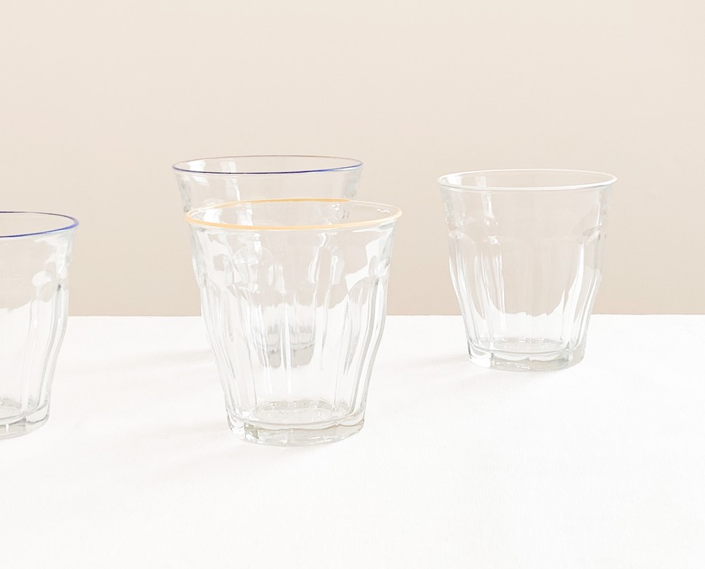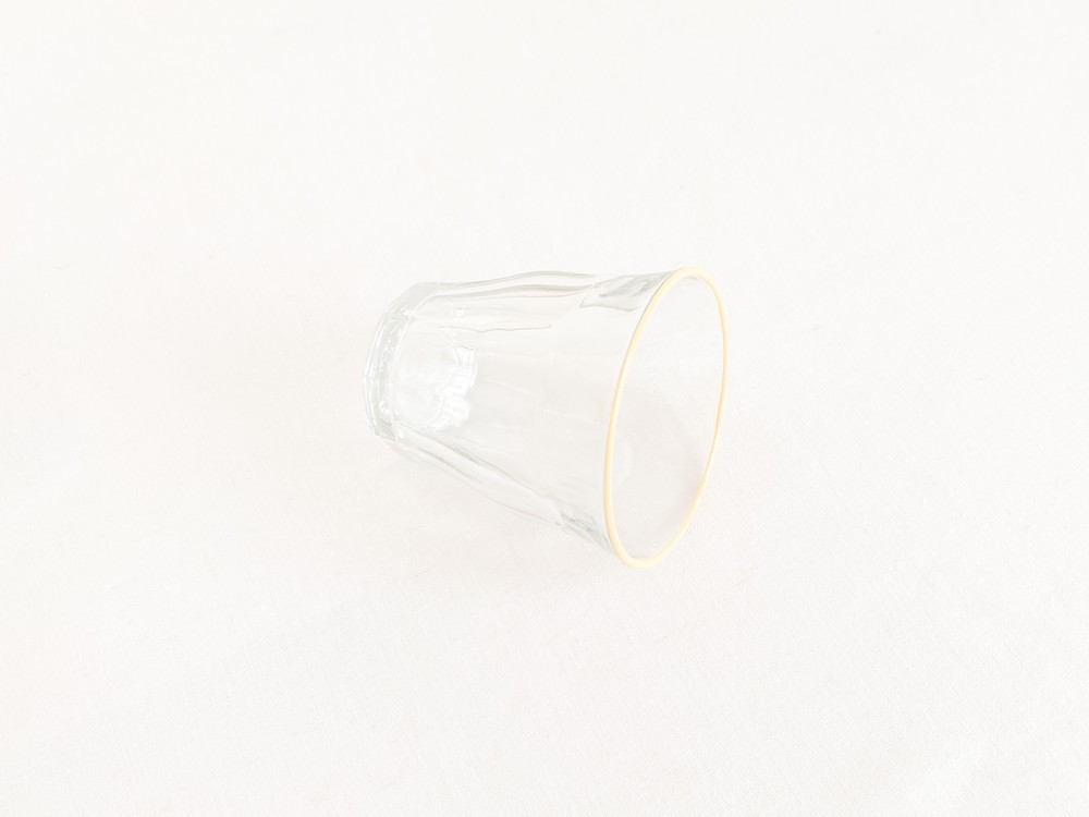 유앤웬즈데이만을 위해 제작된 듀라렉스의 유리잔은 1940년대 중반즈음 카페와 식당에서 사용될 용도로 만들어진 피카디 글라스로, 시간과 장소에 구애받지 않는 실용적인 제품들을 만드는 듀라렉스의 모티브가 잘 담겨있는 제품입니다. 반짝이는 면들로 이루어진 고전적인 실루엣은- 소재와 자연스럽게 어울리며 프렌치라는 말이 잘 어울리는 적당한 장식이 되고, 손에 가볍에 들릴 수 있는 기능적인 역할도 함께 가지고 있습니다. 유리잔의 윗 면에는, 에나멜소재의 커스터드 크림을 떠올리는 노랑의 줄무늬가 그려져있습니다.
